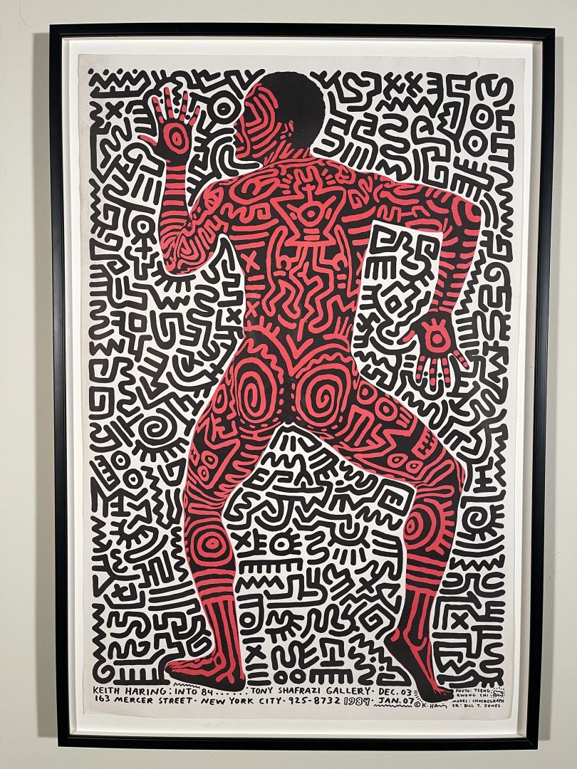 Haring, Keith. KEITH HARING INTO '84. SHAFRAZI GALLERY POSTER. Offset lithograph in colors, 1984, Sheet 35 1/8 x 23 1/8 inches; 892 x 587 mm. The poster, used for an exhibition of Haring's work at Tony Shafrzi's Mercer Street gallery in DecemberJanuary 1983-4, is based on a photograph by Tseng Kwong Chi of Bill T. Jones, nude, with his body painted by Haring. In excellent condition.