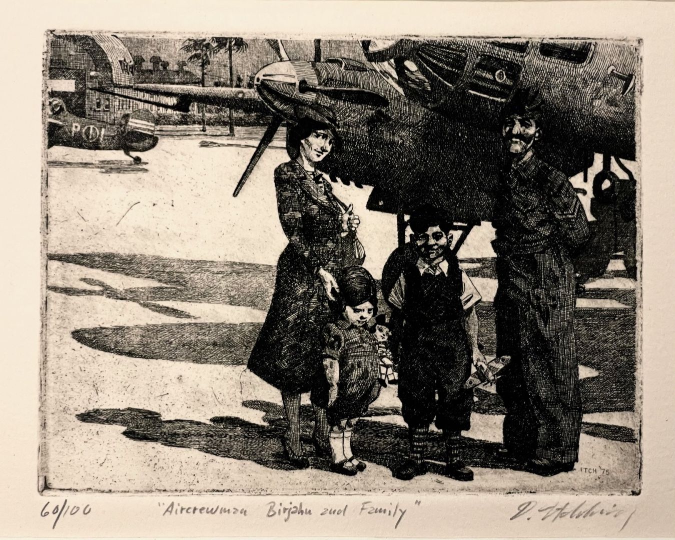 Itchkawitch, David (American, born 1937). AIR CREWMAN BIRJAHN AND FAMILY. Etching, not dated. Edition of 100, numbered 60/100, and signed and titled in pencil. 4 1/2 x 5 3/4 (plate), 7 1/2 x 11 1/4 (sheet). With tack holes for drying and deckled edges. In excellent condition. David Itchkawitch was born in Rhode Island in 1937. He graduated from RISD and also studied in Italy as part of RISD's Honors Program. He has produced a large body of etchings of which he says, "My work represents invented situations which look believable at first glance. I feel it is almost a test to see whether I can create a believable, interesting situation with a good composition." He currently lives and works in Maine.