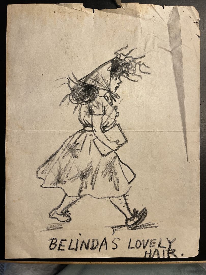 Bacon, Peggy BELINDA'S LOVELY HAIR. Charcoal on paper. 11 x 8 1/2 inches.Titled, but unsigned. Bacon's daughter shown with wild hair breakingout of a kerchief, and with spiky hair growing on her legs. Mom's way of telling daughter to look to her personal grooming. The sheet with wrinkles, creases, tears, small losses at the top edge. Nevertheless a humorous and artistic caricature which offers insight into Bacon's domestic life.