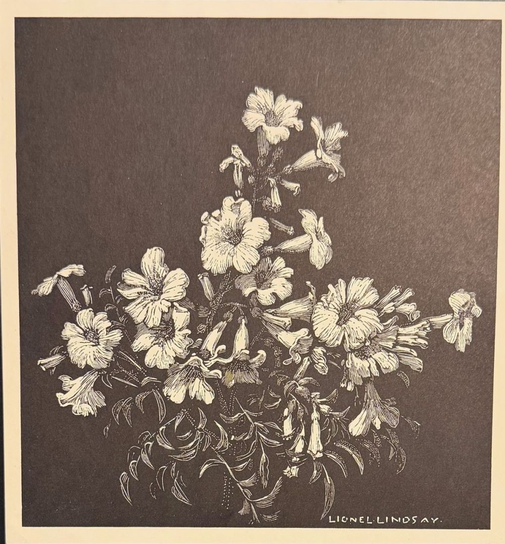 4Lindsay, Lionel (Austarlian, 1874-1961). BEGONIAS. Wood engraving, not dated, but circa 1920s. Aside from the numbered edition, and sgned only in the block 6 x 5 7/8 inches (image), 8 1/2 x 7 3/4 inches (sheet). In excellent condition.