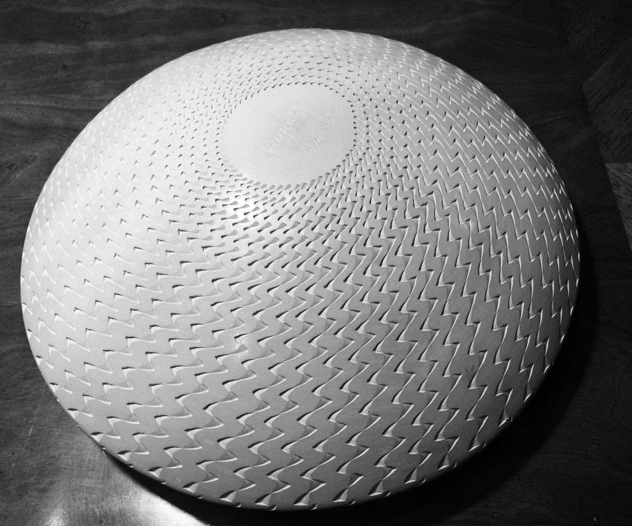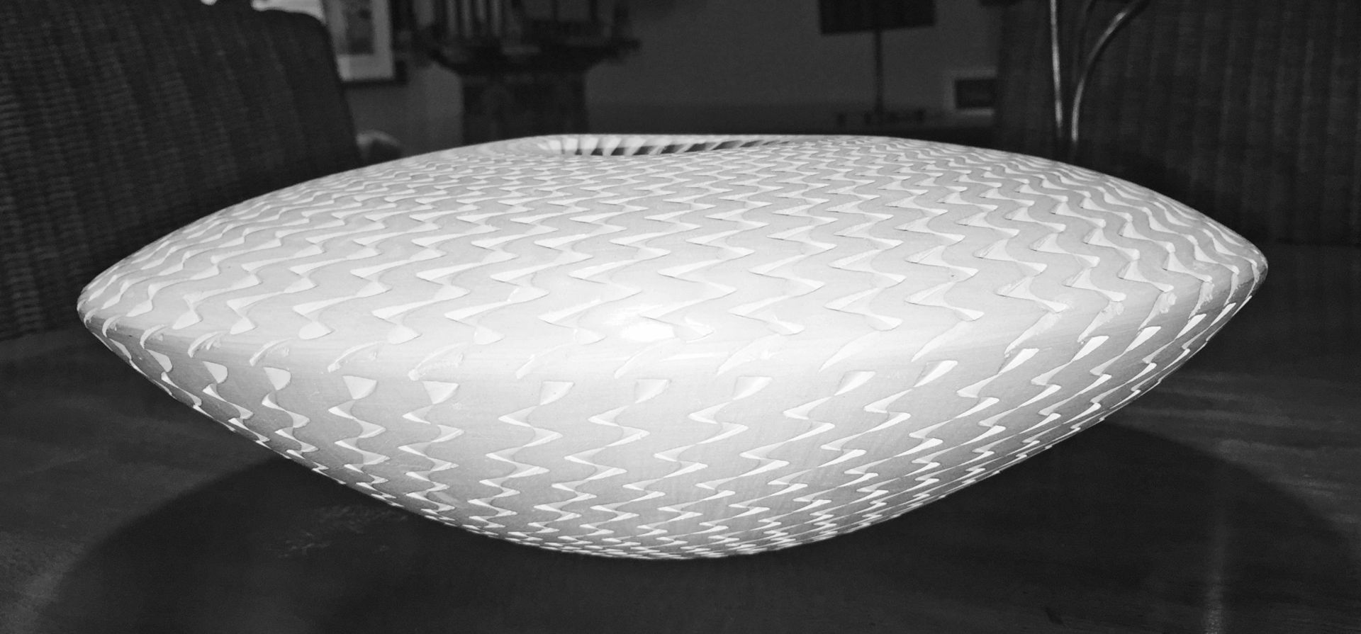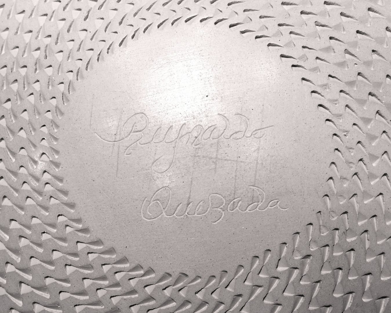 (Quezada, Reynaldo). BOWL or LOW VASE. Mata Ortiz. Coil built, burnished white body with incised design. 13 1/4 inches diameter, 3 1/2 inches high. Reynaldo Quezada, whose brother Juan is the founder of the pottery industry in Mata Ortiz, is one of the first generation of potters. Known for this shape and style, he usually works with black glaze. This white piece is unusual. In excellent condition.