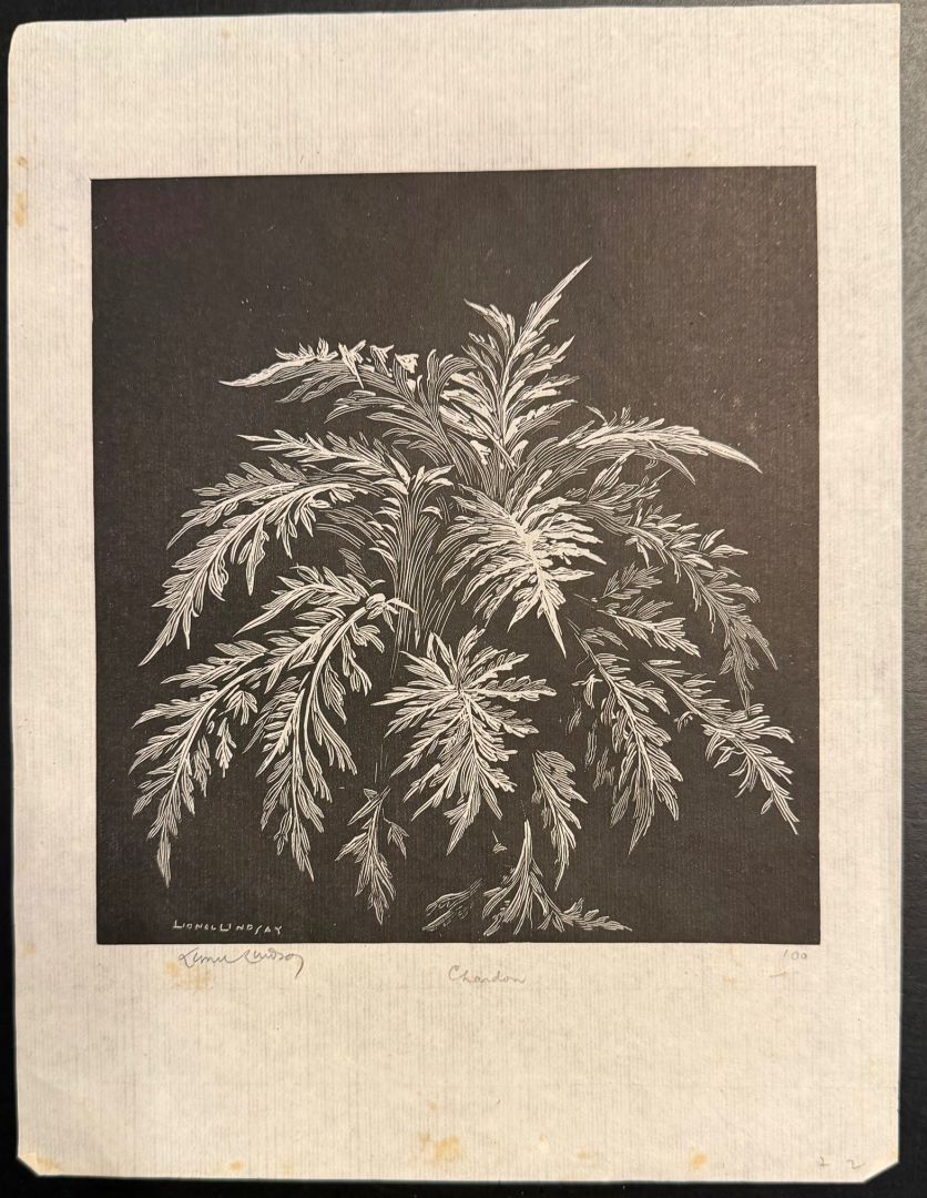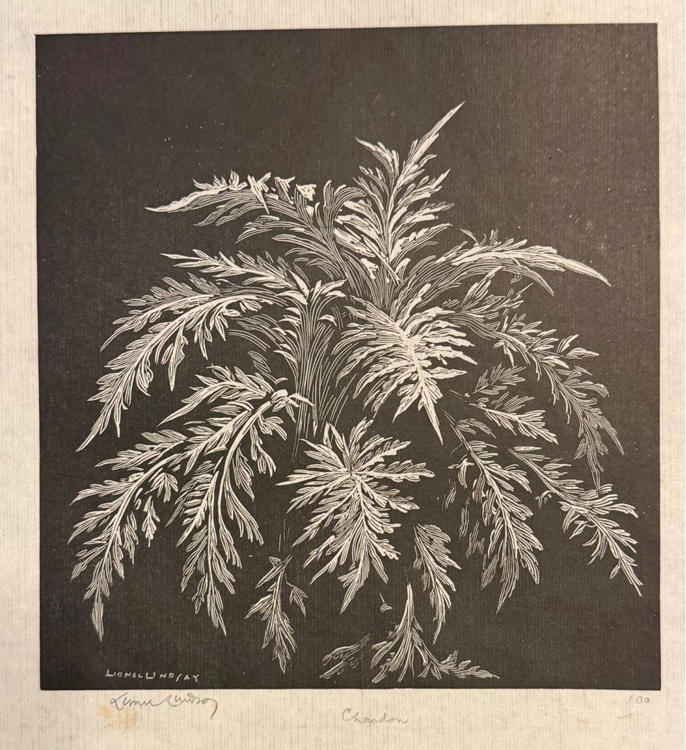 Lindsay, Lionel (Austarlian, 1874-1961). CHARDON. Wood engraving, not dated, but circa 1920s. Edition OF 100. Signed in pencil and also in the block,, titled and inscribed "100." 5 7/8 x 5 3/4 inches (image), 9 x 6 3/4 inches (sheet). Pritned on thin tissue. In excellent condition despite a few spots of foxing at the extreme edges of the margin, left and bottom.