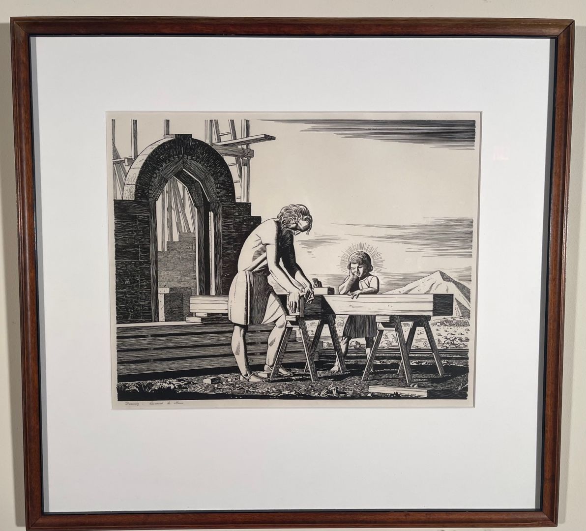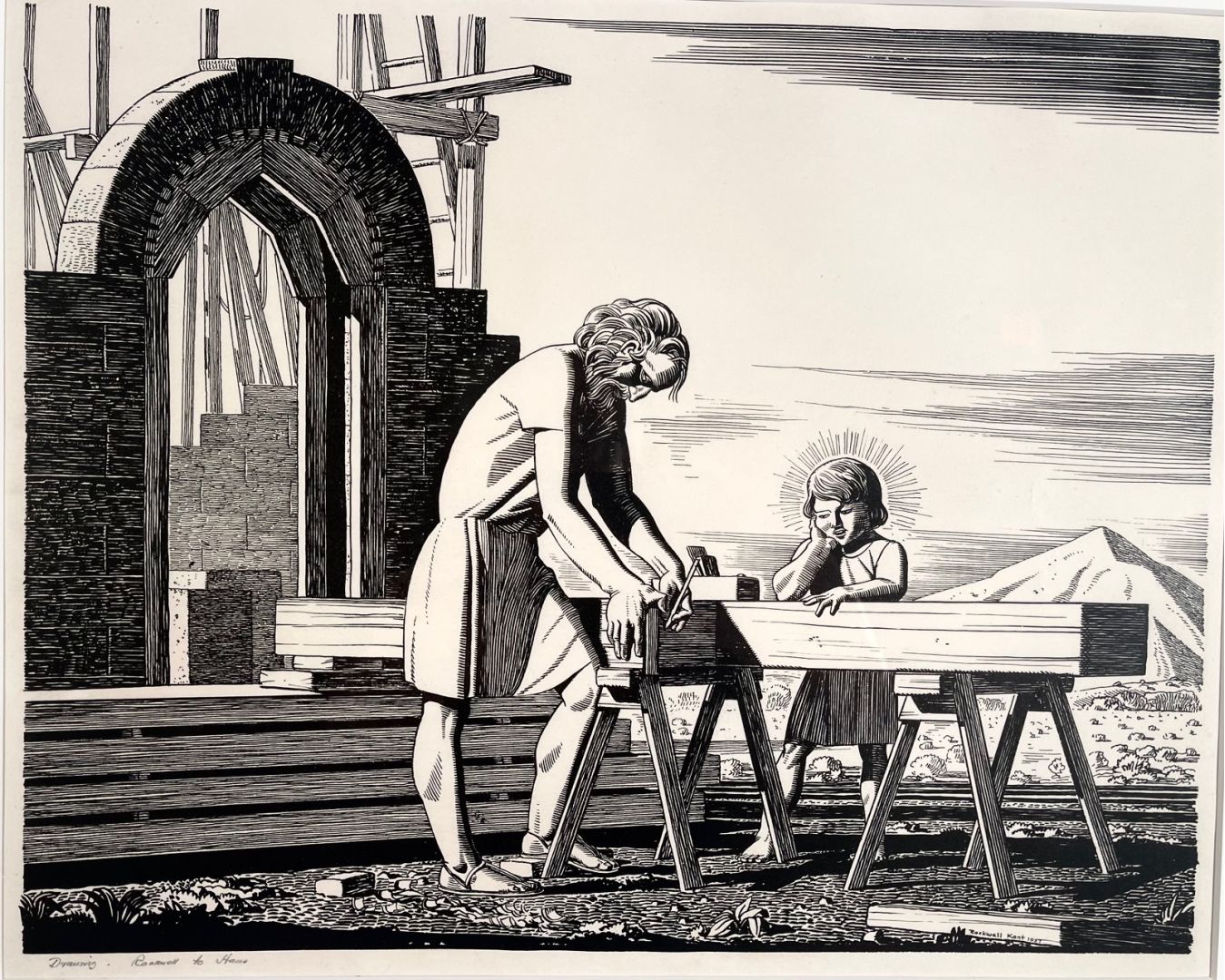 Kent, Rockwell. (After) JESUS AND JOSEPH. Offset Lithograph after a drawing, 1937. The drawing illustrates Joseph working on a carpentry project watched by the haloed child Jesus. Kent used the drawing as the basis for a Christmas card in 1937, and had some lithographs made, some of which he signed in pencil. This one is not signed but is inscribed, in Kent's distinctive handwriting "Drawing - Rockwell to Hans" in pencil, lower let. The lithograph is also signed and dated with the image. There was no "edition" of this work, and it appears to be quite scarce. 11 3/8 x 14 7/8 inches (image), on a larger sheet. Framed to 211/4 x 23 3/4 inches. In excellent condition. MOVED TO #14546