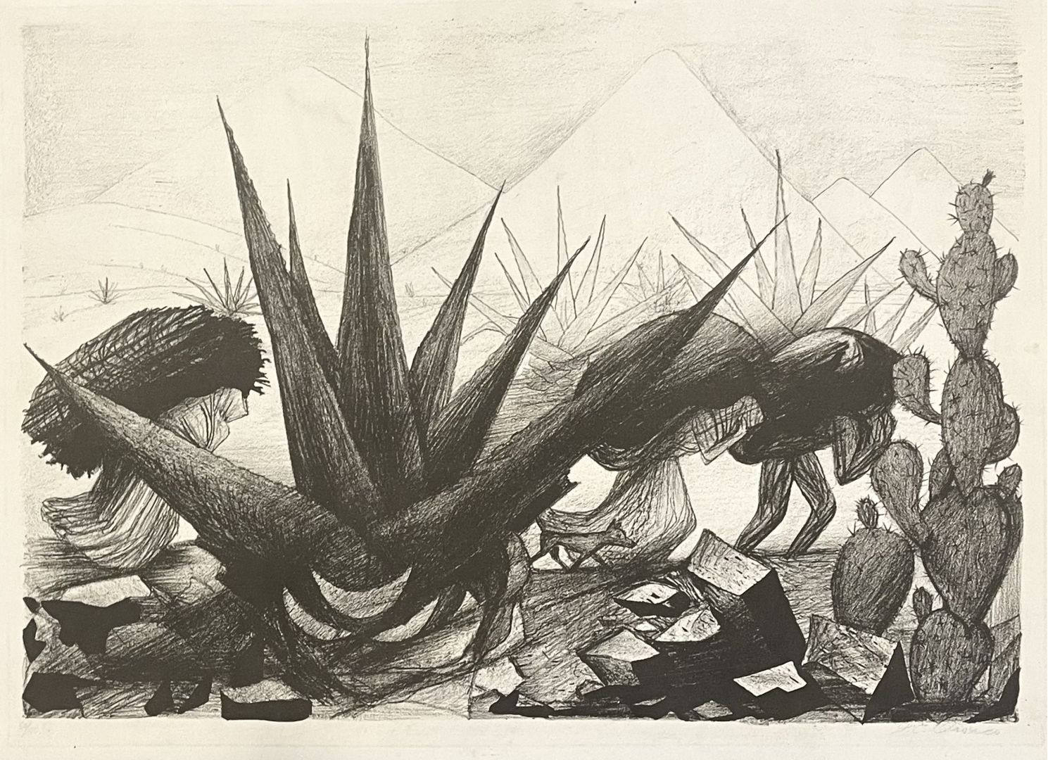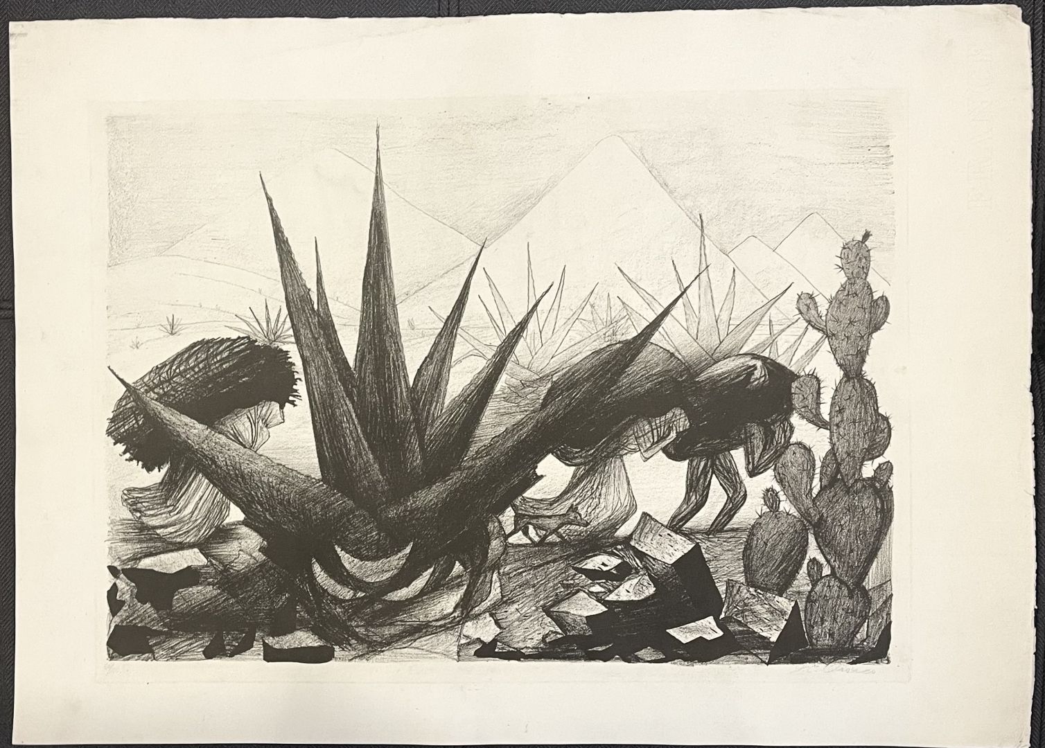 Orozco, Jose Clemente (Mexican, 1883 – 1949) MAGUEYAS Y NOPALES or INDITOS. Hopkins 17 Lithograph, 1929. Signed lower right and numbered 60/100 lower left. 12 1/8 x 17 1/16 inches 308 x 434 mm (image) 15 3/4 x 22 inches (sheet). In very good condition. Magueyas are Agave and Nopales are prickly pear cactus, but the scene shows workers bent under heavy loads amid the plants. Inditos are Indians, that is, indigenous people. By featuring the plants, and placing the people in the background, where your eye sees them only at second look, Orozco seems to be saying that they are valued less than the agave they are harvesting.