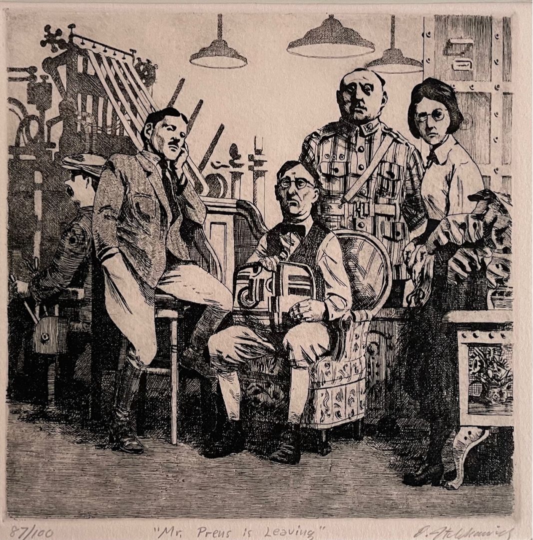 Itchkawitch, David (American, born 1937). MR. PREUS IS LEAVING . Etching, not dated. Edition of 100, numbered 87/100, and signed and titled in pencil. 5 3/4 x 5 7/8 (plate), 7 1/2 x 11 1/4 (sheet). With tack holes for drying and deckled edges. In excellent condition. David Itchkawitch was born in Rhode Island in 1937. He graduated from RISD and also studied in Italy as part of RISD's Honors Program. He has produced a large body of etchings of which he says, "My work represents invented situations which look believable at first glance. I feel it is almost a test to see whether I can create a believable, interesting situation with a good composition." He currently lives and works in Maine.