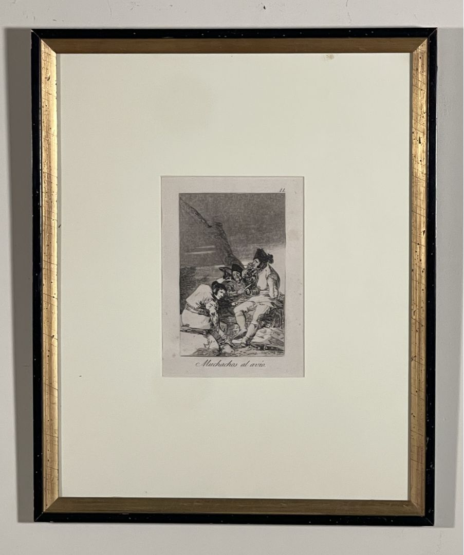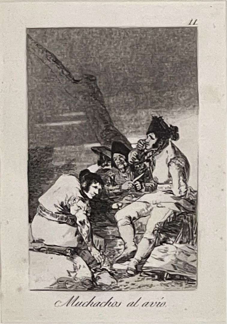 Goya, Francisco (Spanish, 1746-1828). MUCHACHOS AL AVIO (LADS MAKING READY). Harris 46, State iii. Etching, aquatint, and engraving, 1799. Plate 11 from the First Edition of Los Caprichos. Printed on laid paper. 8 1/2 x 5 7/8 inches (plate). Framed to 22 x 18 inches. In very good condition.