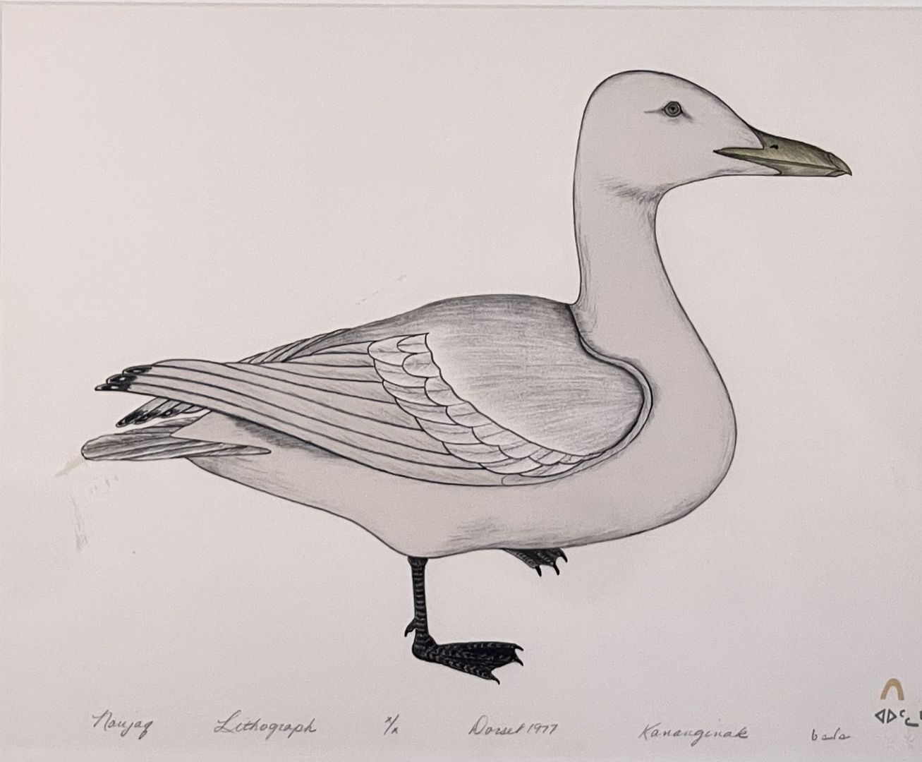 Pootoogook, Kanangiak. (Inuit/Canadian 1935-2010). NAUJAQ (Seagull) Lithograph, 1977. Titled, Dated, numbered "X/X" and further inscribed, all in pencil, and with the chop and embossing of the artist and the publisher. 15 x 18.5 inches, 380 x 470 mm. (sheet). Framed to 22 x 25 inches. In excellent condition.He was a nephew of Peter Pitseolak.