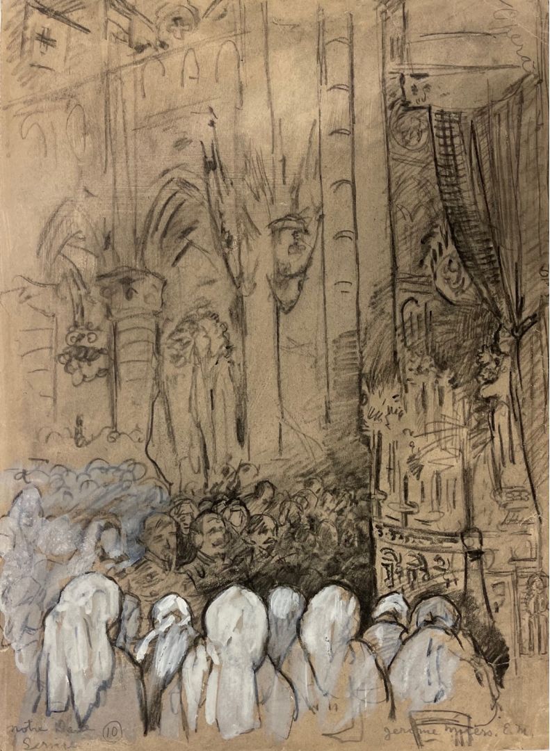 Jerome MYERS NOTRE DAME SERVICE Myers, Jerome (American. 1867-1940). NOTRE DAME SERVICE Drawing, pencil and white chalk on paper, 1905. Signed and titled within the imgage12 x 9 inches (sheet). In very good condition. Inventory # 14646 Price: $750.00 Add to Cart
