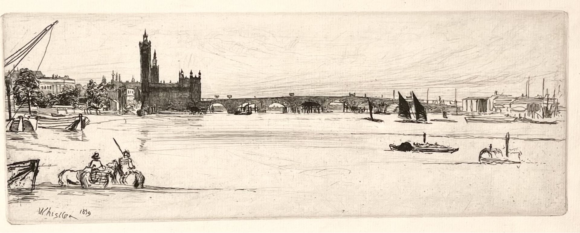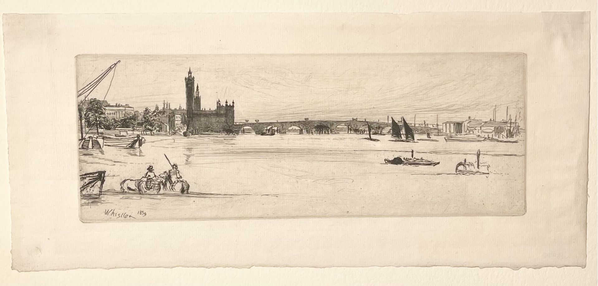 Whistler, James A. M. OLD WESTMINSTER BRIDGE. Etching and Drypoint, 1859. Glascow 47,Kennedy 39 .Third State of four. Printed on thin laid paper with watermark (Pro Patria?). The drypoint lines of the sky and water print faintly, indicating wear to the plate prior to the fourth state. Signed and dated in the plate, lower left. 3 x 7 7/8 inches (plate), 4 1/2 x 10 inches (sheet). This print is one of the sixteen views inclused in the "Thames Set" of 1871. In excellent condition.