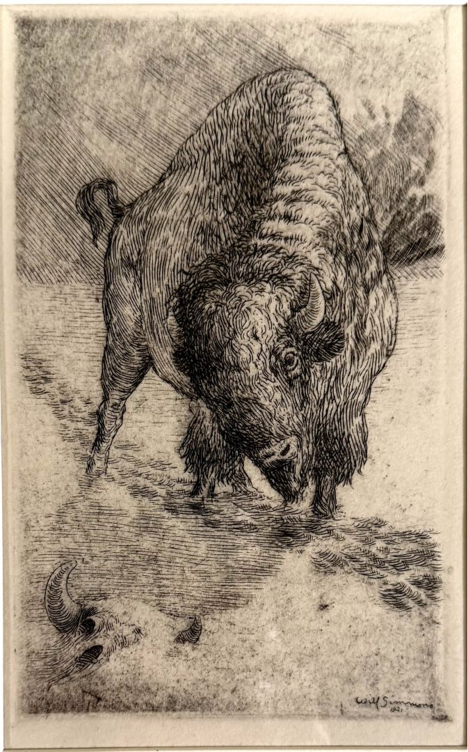 Simmons, Will (American, 1884-1947). BISON ON THE TRAIL, VERSION II. Etching, 1921. Edition size not known. Signed and dated in the plate. 5 7/8 x 4 inches (plate), 8 3/8 x 6 5/8 inches (sheet). In excellent condition.