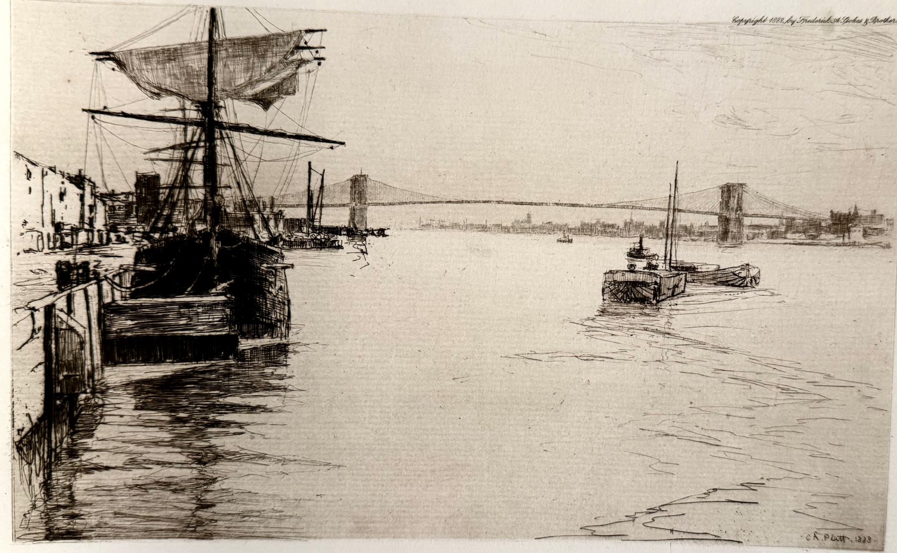 Platt, Charles Adams (American 1861-1933). BROOKLYN BRIDGE (THE EAST RIVER BRIDGE). Etching, 1888. Signed and dated in the plate. Published by Frederick Stokes and Brother. 6 3/4 x 11 7/8 inches (plate), 12 3/8 x 17 1/4 inches (sheet). In very good condition, but with some short tears and ships at the edges of the sheet.