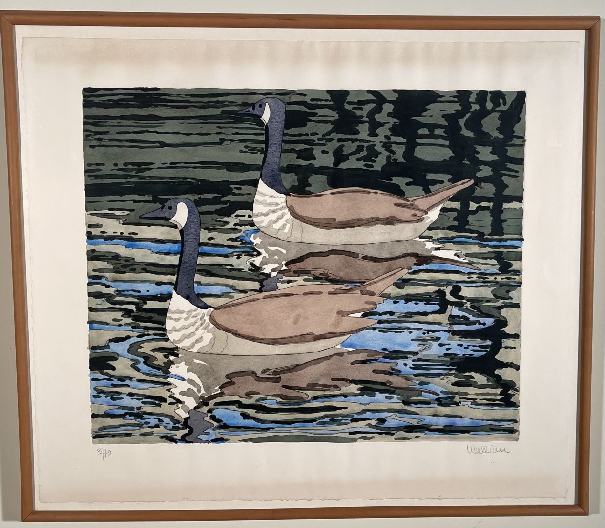 Welliver, Neil (Ameerican, 1929-2005) CANADIAN GEESE. Etching with hand-colorong, 1978. Edition of 40, signed in pencil and numbered "3/40." 21 3/4 x 28 5/8 inches (plate), 28 5/8 x 33 3/8 inches (sheet), framed to 31 3/4 x 36 3/4 inches. Discoloration from adhesive along the top and bottom margin edges, well away from the image, else in excellent condition, with very strong colors.