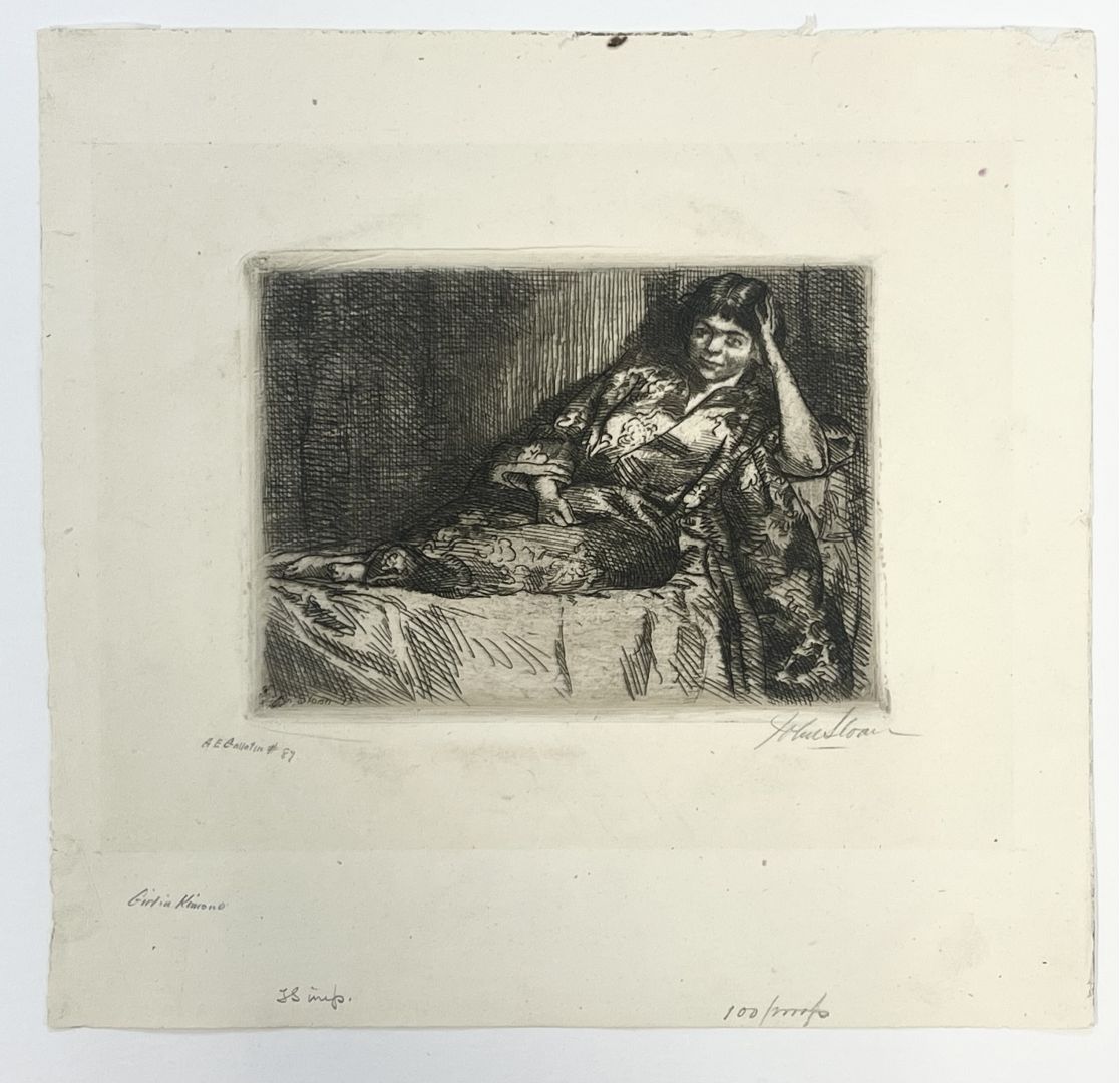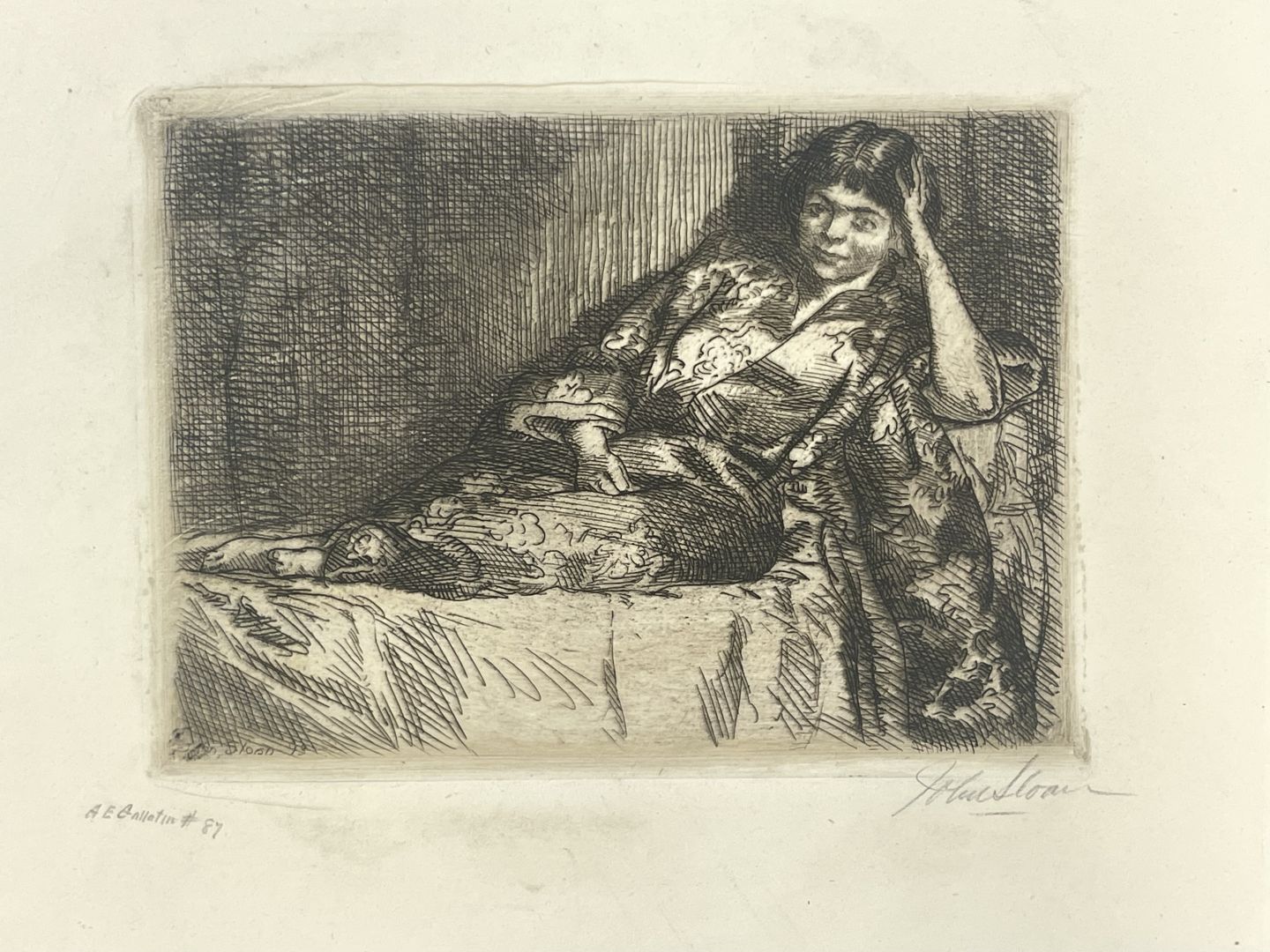 Sloan, John. GIRL IN KIMONO. Morse 164. Etching, 1913. Edition 100, of which only 45 were printed according to Morse, 25 by Platt and 20 by Roth. This, however, is signed by Sloan, at right, inscribed "JS imp." and "100 proofs" at rhe bottom edge, and further inscribed, at left, just below the platemark "A E Gallatin #87." 4 x 5 1/2 inches (plate), 8 1/4 x 8 3/4 inches (sheet). In very good condition.
