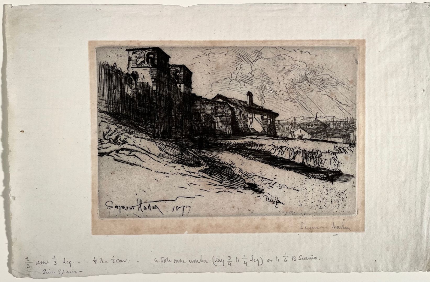 Haden, Francis Seymour. GRIM SPAIN. Etching, 1877. An apparent trial proof of the only State. Signed and dated in the plate, and also signed in pencil, and annotated extensively in the lower marginwith in Haden's hand with what appear to be notes about the ink mix to be used. Printed on thin laid paper with deckle. Edition size not known. 5 /78 x 9 inches (plate), 9 1/8 x 14 3/8 inches (sheet) In excellent condition.