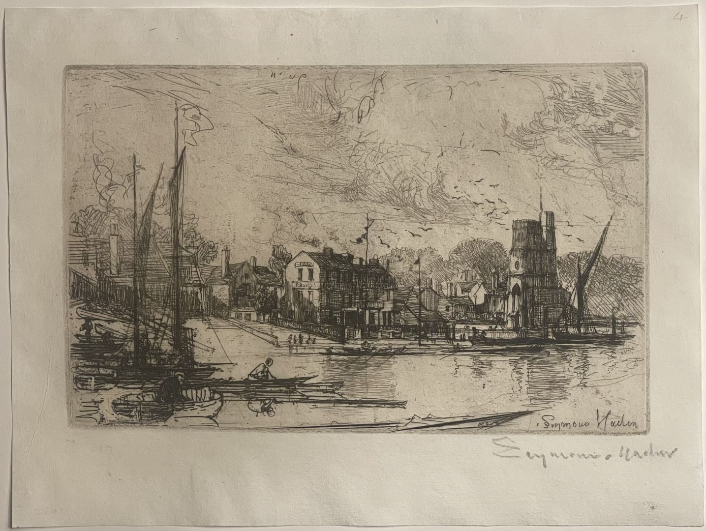Haden, Francis Seymour. HARRY KELLY'S, PUTNEY. Etching and Drypoint, 1865. State IV of IV; Signed in the plate and in pencil. Printed on thin laid paper. Edition size not known. In excellent condition. 4 1/8 x 6 3/4 inches (plate), 6 x 8 inches (sheet)Schneiderman notes that some drypoint work wore away in the printing of the fourth state, so that those lines, e.g. the reflection in the water of the smaller flagpole, center, disappears in later impressions, which this appears to be.