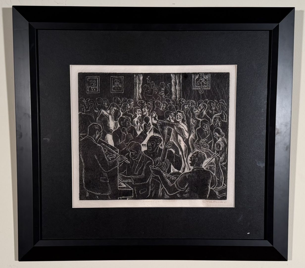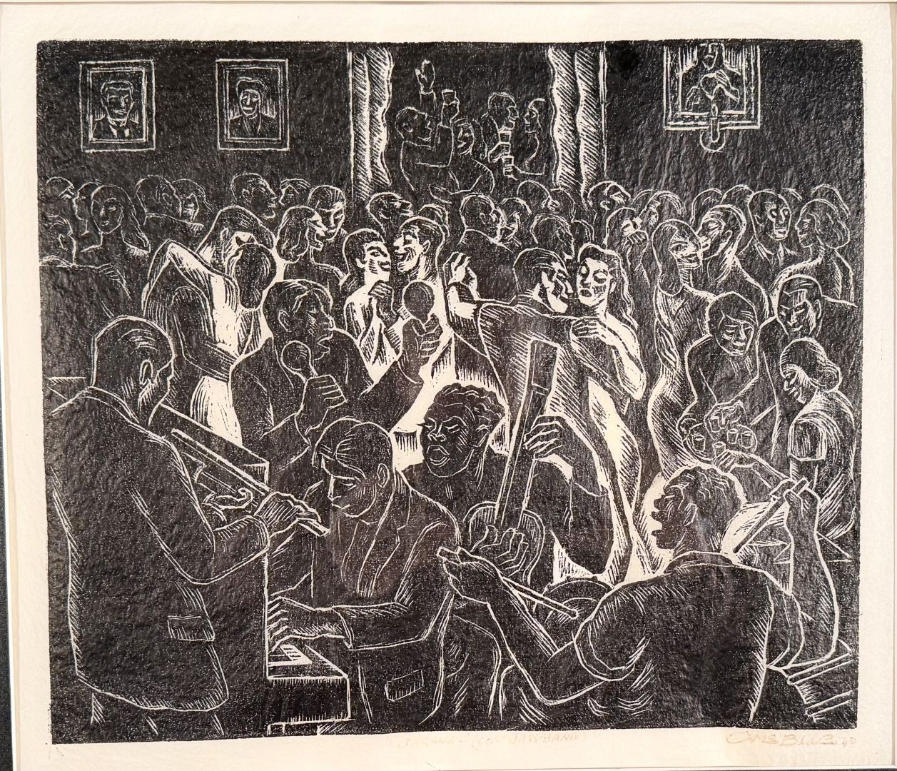 Blas, Camilo (Peruvian, 1903-1985). JARANA CON JAZZ BAND.Linocut, 1940. Titled, signed, and dated in ink in the lower margin. 11 x 13 1/4 inches (image) plus margins, Framed to 22 3/8 x 24 inches. In very good condition, but with fading to the inked title and signature.A Jarana is a very lively, crowded, and noisy party.