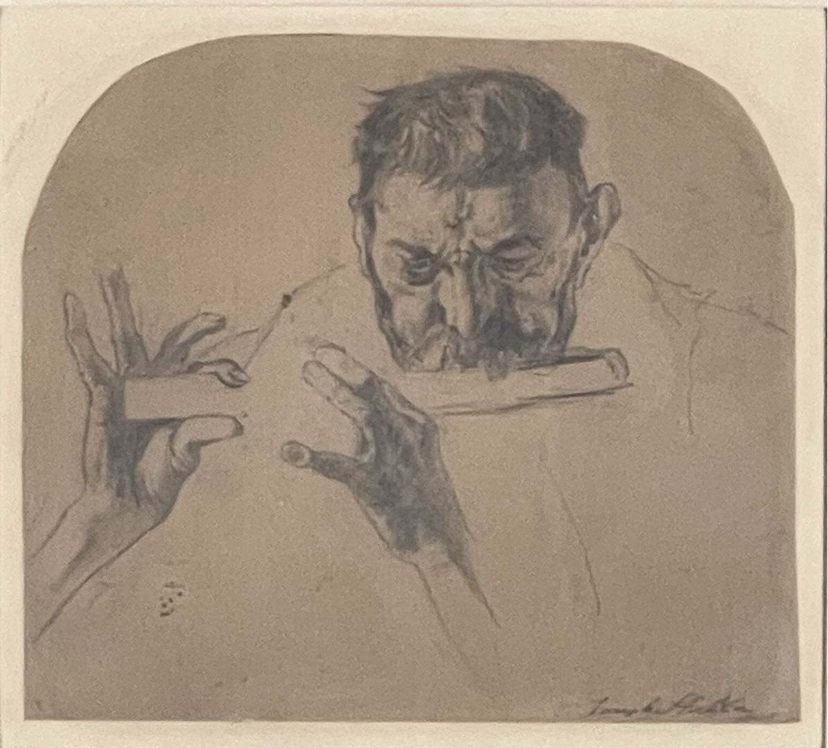 Stella, Joseph (American, 1877-1946). MAN PLAYING PICCOLO. Pencil on paper, 1908. Signed and dated, lower right. 6 1/4 x 7 inches, framed to 14 x 14 inches. Identified on labels of Davis Gallery and Davis and Long Gallery, NYC. In excellent conditon.
