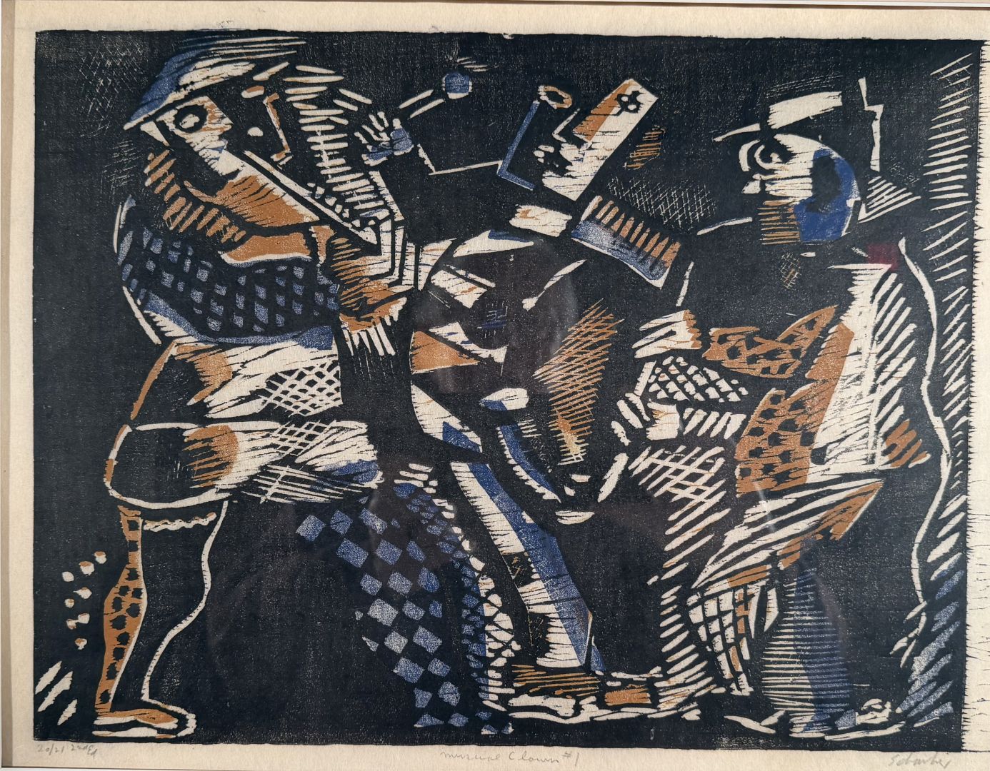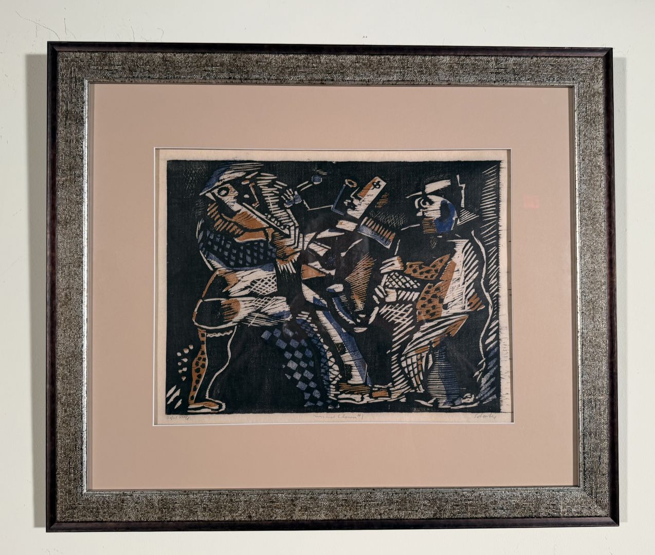 Schanker, Louis (American, 1903-1981). MUSICAL CLOWNS, Color Woodcut, 1937 Brooklyn Museum Booklet 31. From the Second Edition Edition of 21 (The first edition was 30, plus 12 Trial Proofs, making the total for this print 62). Signed, titled, and numbered 20/21, all in pencil. Printed on Japan paper. 11 1/2 x 15 inches (image), framed to 21 1/4 x 25 inches. In excellent condition.