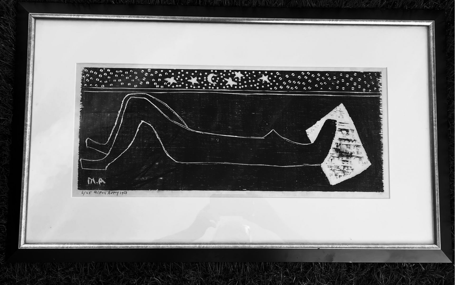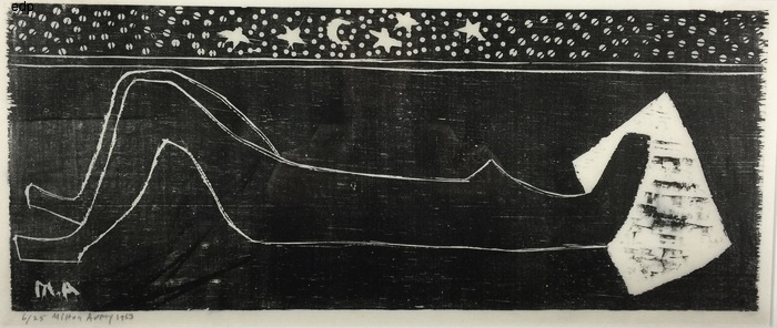 Avery, Milton. NIGHT NUDE. Woodcut, 1953. Edition of 25 in black and white (there were a further 25 printed in black and blue). Signed, dated and numbered "6/25" in pencil, and also monogrammed within the image. 9 3/4 x 24 inches, 246 x 610 mm. A Fine impression in excellent condition.