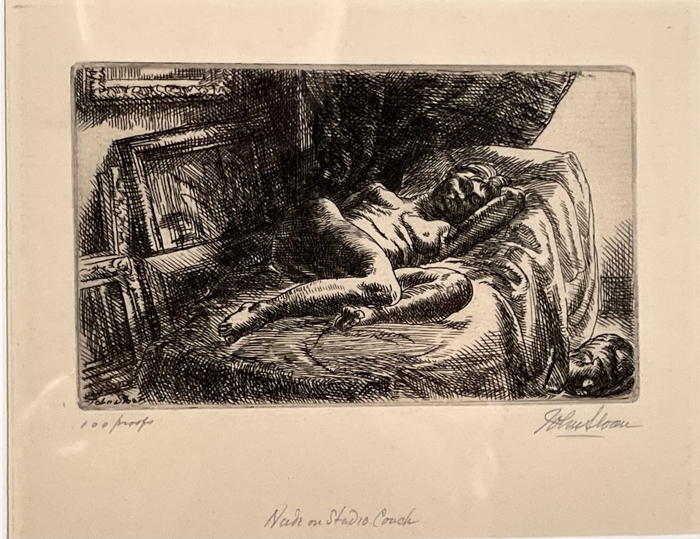 Sloan, John. NUDE ON STUDIO COUCH. Morse 260. Etching and engraving, 1931. Edition of 100, of which only 51 were printed by White. Inscribed "100 proofs" titled, and signed, all in pecil, and also signed "Chas White imp." at the lower left edge. 3 x 5 inches (plate), 9 1/2 x 12 1/2 inches sheet. In excellent condition.