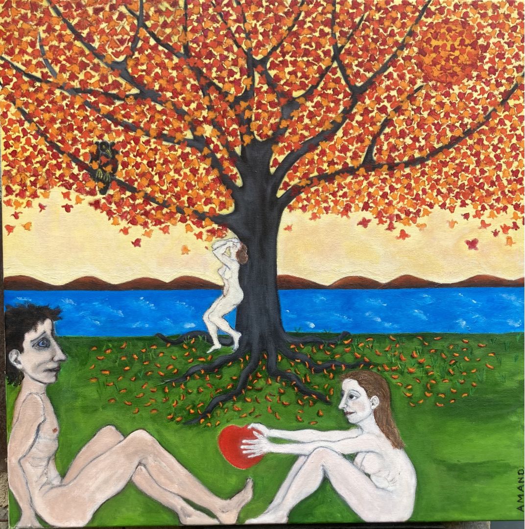 AMAND (American, works in France). PARADISE LOST. Acrylic on Canvas, 2019. 24 x 24 inches.AMAND has studied painting at the Art Students League in New York and is currently living in a medieval village in southwest France. AMAND has a Bachelor's Degree in Architecture from the University of Michigan and a Master's Degree from San Francisco State in English Literature. AMAND has exhibited work in San Francisco, New York and in several places in France.