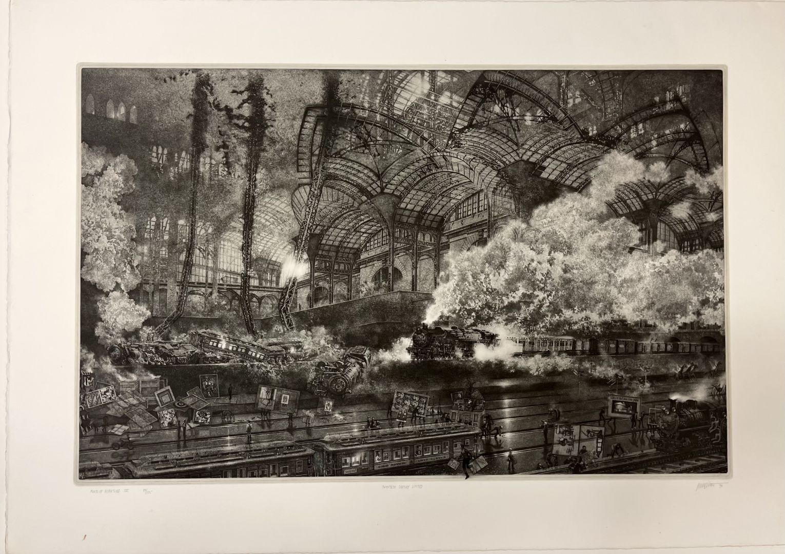 Milton, Peter (American, born 1930). POINTS OF DEPARTURE III: TWENTIETH CENTURY LIMITED. Milton 118. Resist-ground etching and engraving on copper, 1997. Edition of 175. Signed and dated in pencil. Printed on BFK Rives paper. 24 x 38 inches, 610 x 965 mm. (plate). 30 X 42 inches (Sheet). In excellent condition.There is extensive commentary about this print on the artist's website.