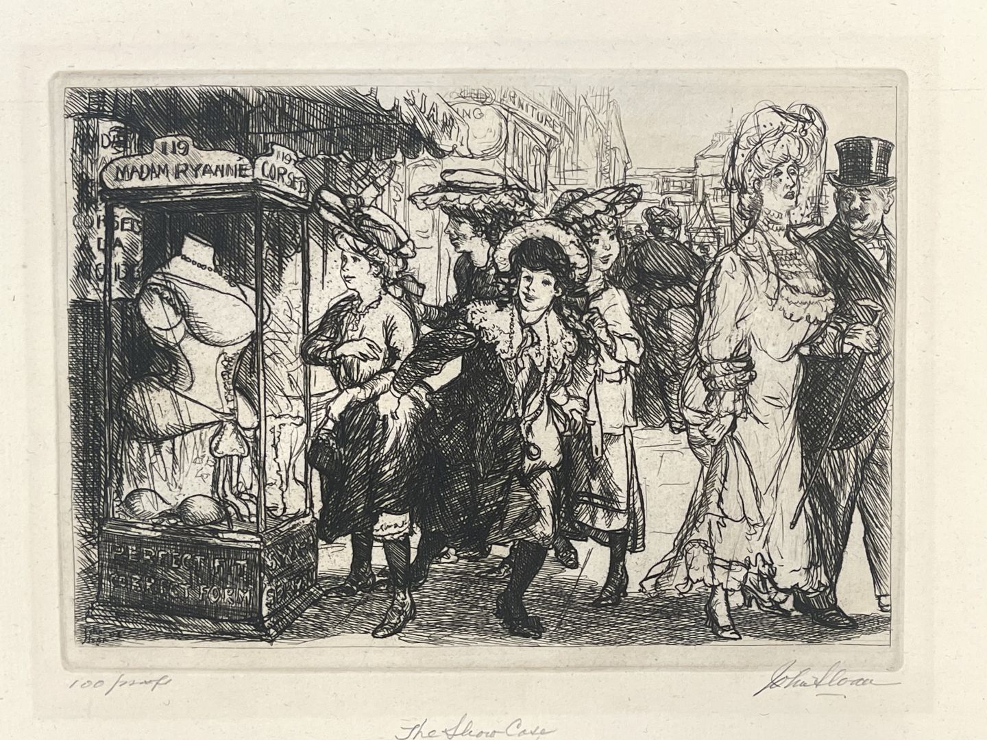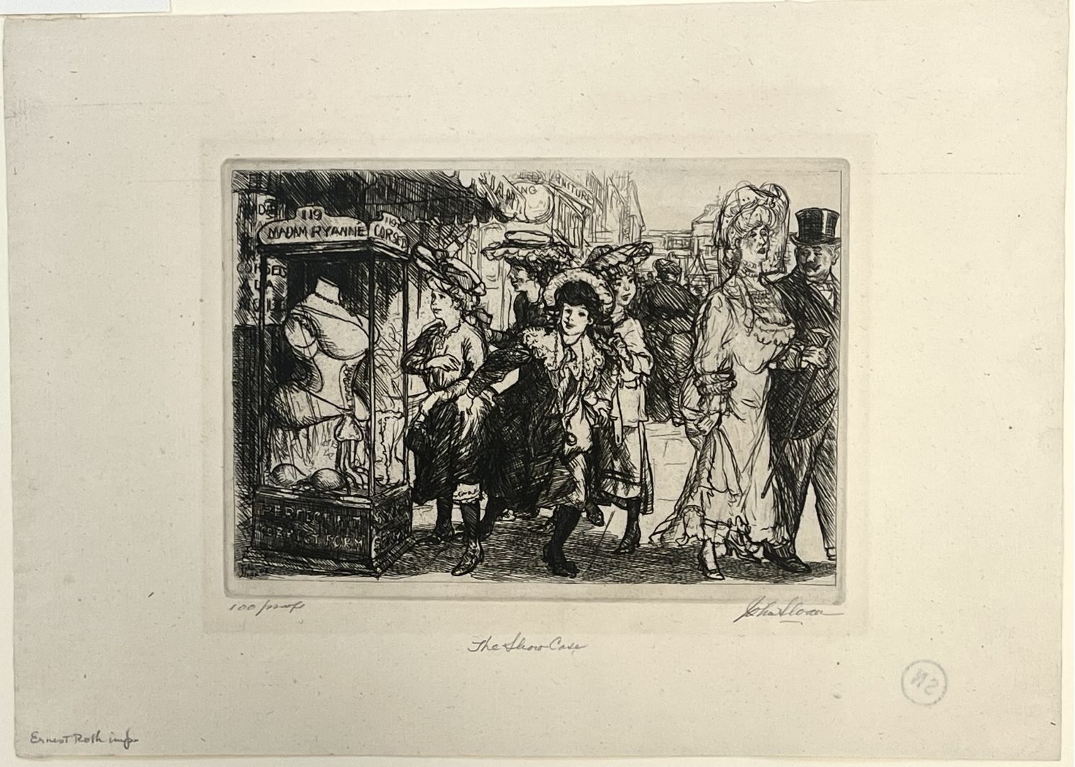 Sloan, John. THE SHOW CASE. Etching, 1905 (M.129) 4 1/2 x 6 3/4, inches (plate), 8 1/4 x 11 1/4 inches (sheet). Signed, titled and inscribed "100 Proofs" in pencil, of which 75 were printed, this being printed by Ernes Roth, and signed by him near the lower left edge.With a collector's stamp "SN," which is not in Lugt,verso. From the New York Life series. In excellent condition.