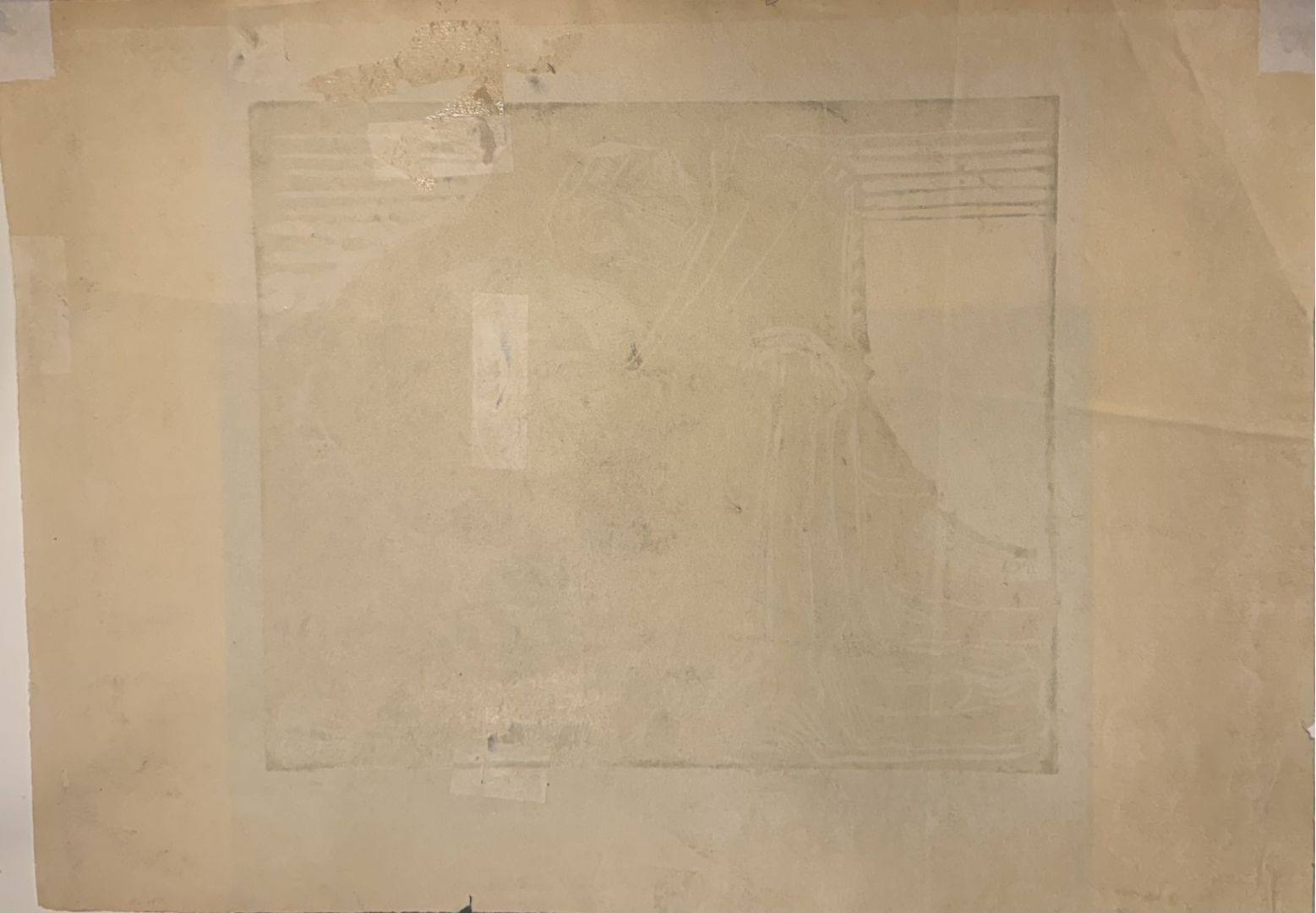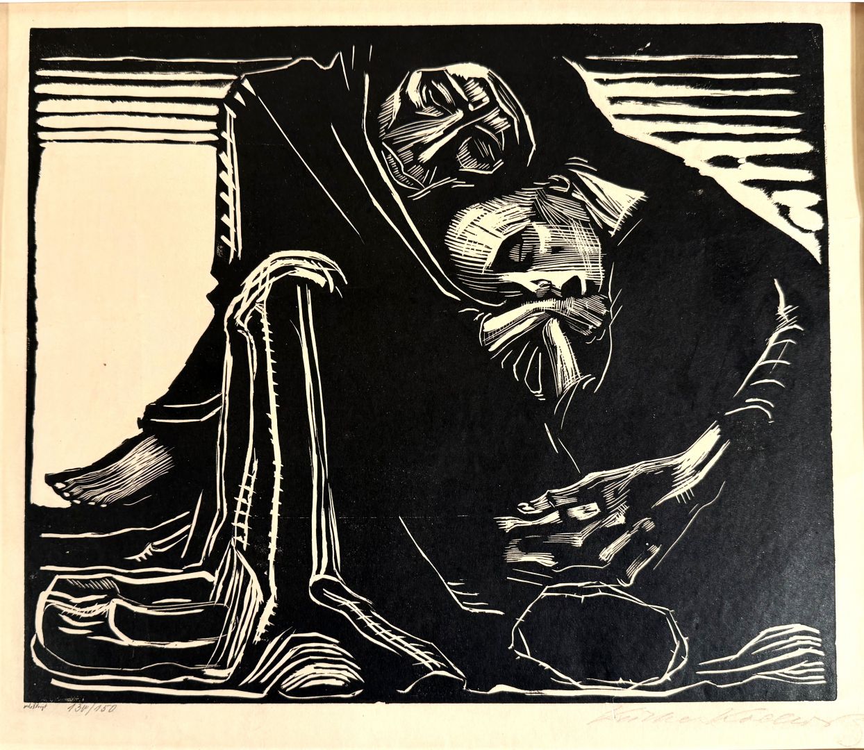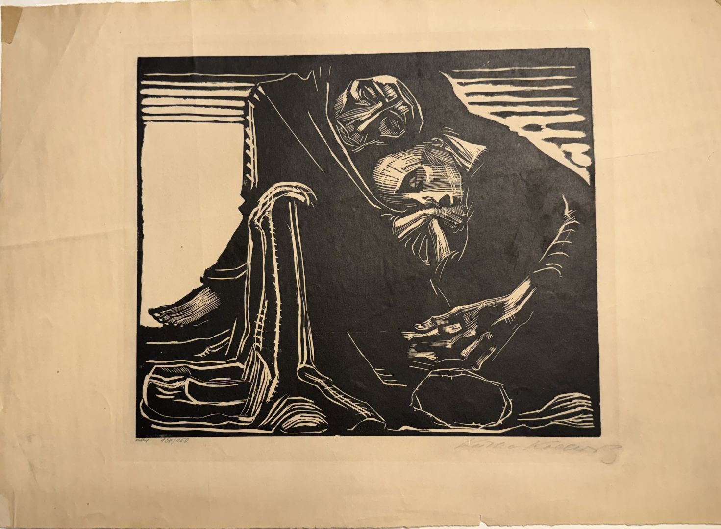 Kollwitz, Kathe (German, 1867-1945). TOD MIT FRAU IM SCHOSS (WOMAN IN THE LAP OF DEATH). Knesebeck 165, Klippstein 151. Woodcut, 1921. Knesebeck's Seventh State, the Edition for “JAHRBUCH / DER / ORIGINAL GRAPHIK / Dritter Jahrgang / 1921 / HERAUSGEGEBEN / VON / PROF. DR. HANS WOLFGANG SINGER / WOHLGEMUTH & LISSNER / KUNSTVERLAGSGESELLSCHAFT M. B. H. / BERLIN”, issued as a portfolio. The edition comprised 150 proofs, 15 of which were on Japan paper, numbered 1/150 to 15/150, 35 on Velin watermarked J. W. Zanders and numbered 16/150 to 50/150, and 100, printed on velin and numbered 51/150 to 150/150. This example is number 130/150. All are described by Knesebeck as "hand-printed through rubbing,signed by Käthe K ollwitz and the printer F. Voigt." Kollwitz's signature is at the lower right, and Voigt's signature, and the number 130/150 are at the lower left. Evidence of a vertical and a horizontal fold; a few small thinned areas in the margins, and a small stabilized break in the paper in the signature, not going into the iimage.