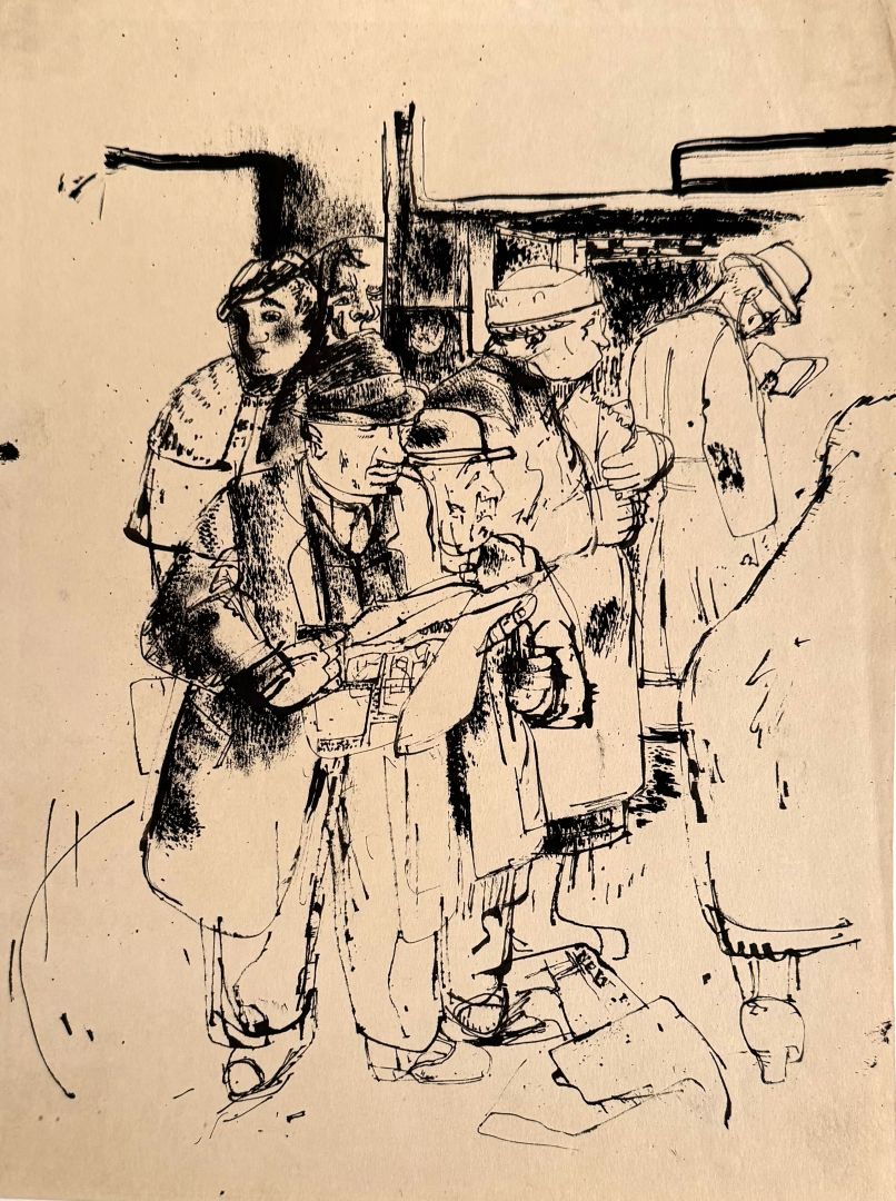 Unknown Artist UNTITLED - PEOPLE WAITING. Drawing, ink on paper. 11 7/8 x 8 7/8 inches. The scene shows a group of people waiting, likely for a train. One man reads a newspaper, another a book, a woman holds a bag of groceries...on an old newspaper laying on the ground one can read the word "NEW" which may indicate the scene is in New York. The drawing has a lot strength, both graphically and in its social realism content. The influence of George Grosz is apparent.