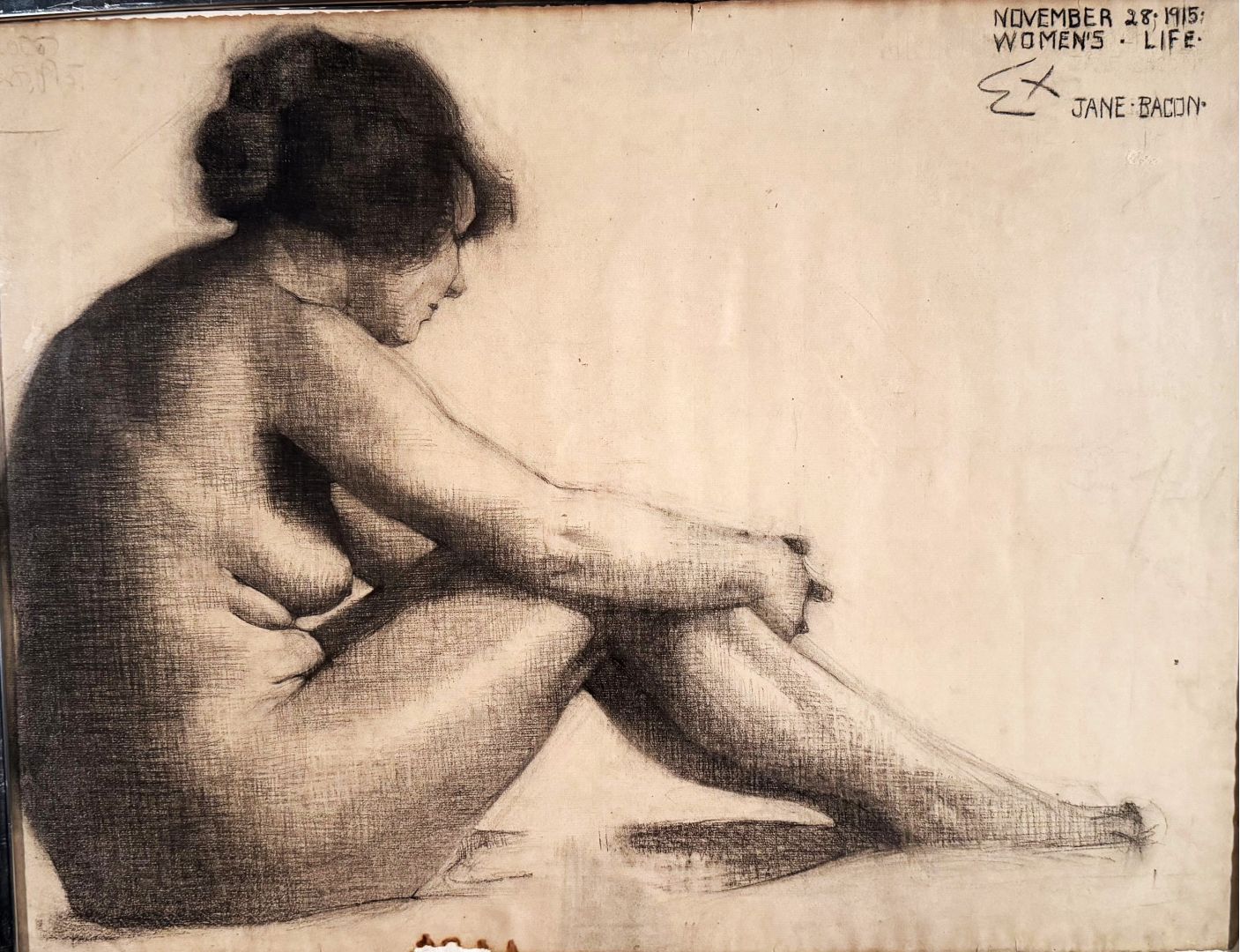 Bacon, Jane. WOMEN'S LIFE - NUDE STUDY. Drawingm charcoal on laid paper watermarked L. Biderville, France, 1915. An academic female nude, drawin in a Life Drawing class. Signed, Dated November 28, 1915, and inscribed "Women's Life." Also inscribed "Ex," likely meaning the instructor's evaluation of the drawing. 19 x 24 3/4 inches (sheet(,framed to 19 3/4 x 25 1/2 inches. A small area oflossat the bottom ofthe sheet, not affecting the drawing, else In very good condition.Edith Jane Bacon, 1879-1971 studied at the Art Institute of Chicago, and is best known as a "white line" printmaker who worked in Provincetown. We don't know that this work is by the same person.
