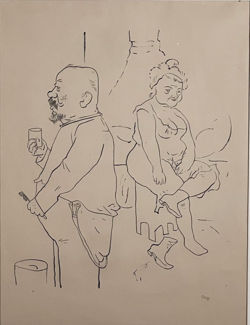 Grosz, George (German, 1893-1959). ZUE HAUSE - PAPPI UND MAMMI (MOMMY AND POPPY AT HOME).Duckers S1-14 and E 82 Photo Lithograph; plate 14 from the ECCE HOMO portfolio, 1922. Edition of 40. Signed in pencil and numbered "9." 18 1/8 x 15 1/8 inches (image), 25 7/8 x 19 5/8 inches (sheet), framed to 30 5/8 x 24 3/4 inches. In very good condition. The illustrations in the First Editions of Ecce Homo are smaller in size. The large format lithographs reproduce the drawings in their original sizes. Duckers believed that these were self-published by Grosz, and, based on the fact that some were declared to be editions of 40, and that the highest number on any found in the estate was lower than 40 (in the case of this print, it was 31.