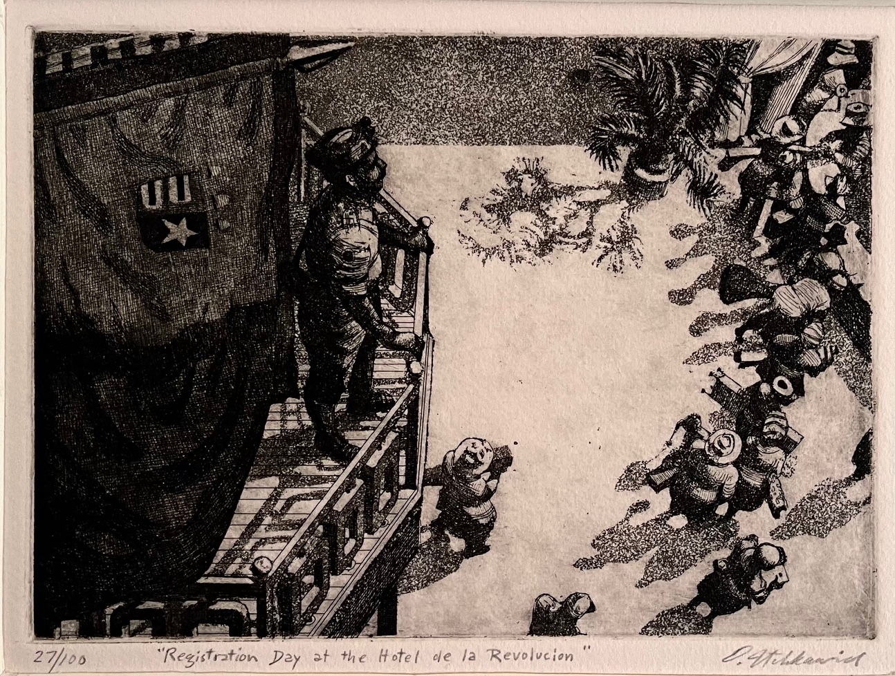 Itchkawitch, David (American, born 1937). REGISTRATION DAY T THE HOTEL DE LA REVOLUTION . Etching, not dated. Edition of 100, numbered 87/100, and signed and titled in pencil. 4 7/8 X 6 3/4 (plate), 7 1/2 x 11 1/4 (sheet). With tack holes for drying and deckled edges. In excellent condition. David Itchkawitch was born in Rhode Island in 1937. He graduated from RISD and also studied in Italy as part of RISD's Honors Program. He has produced a large body of etchings of which he says, "My work represents invented situations which look believable at first glance. I feel it is almost a test to see whether I can create a believable, interesting situation with a good composition." He currently lives and works in Maine.