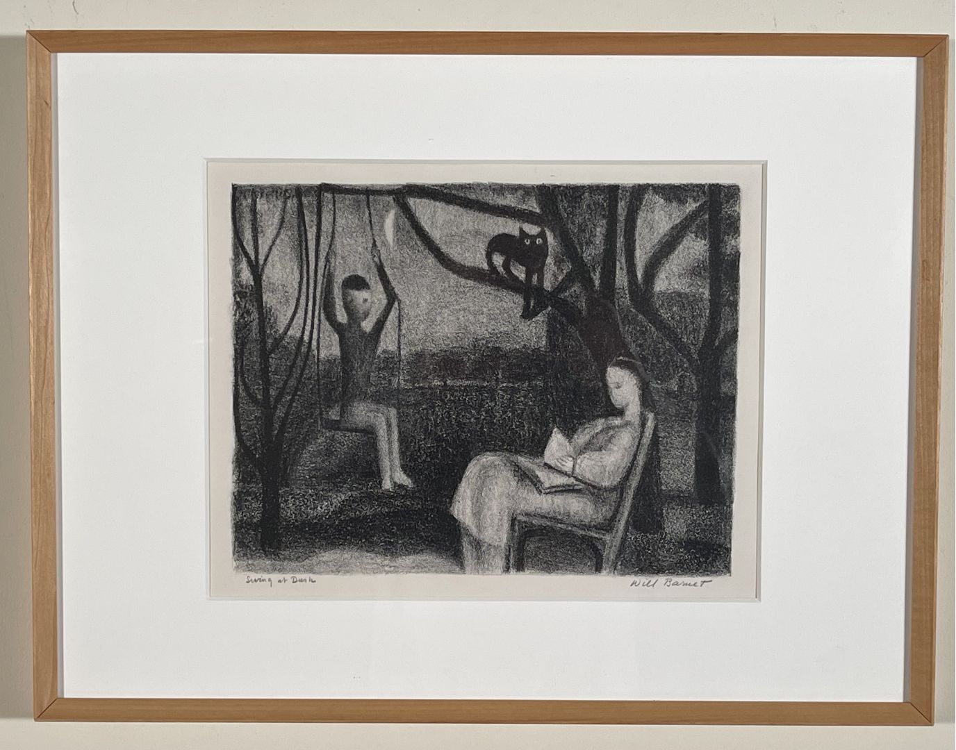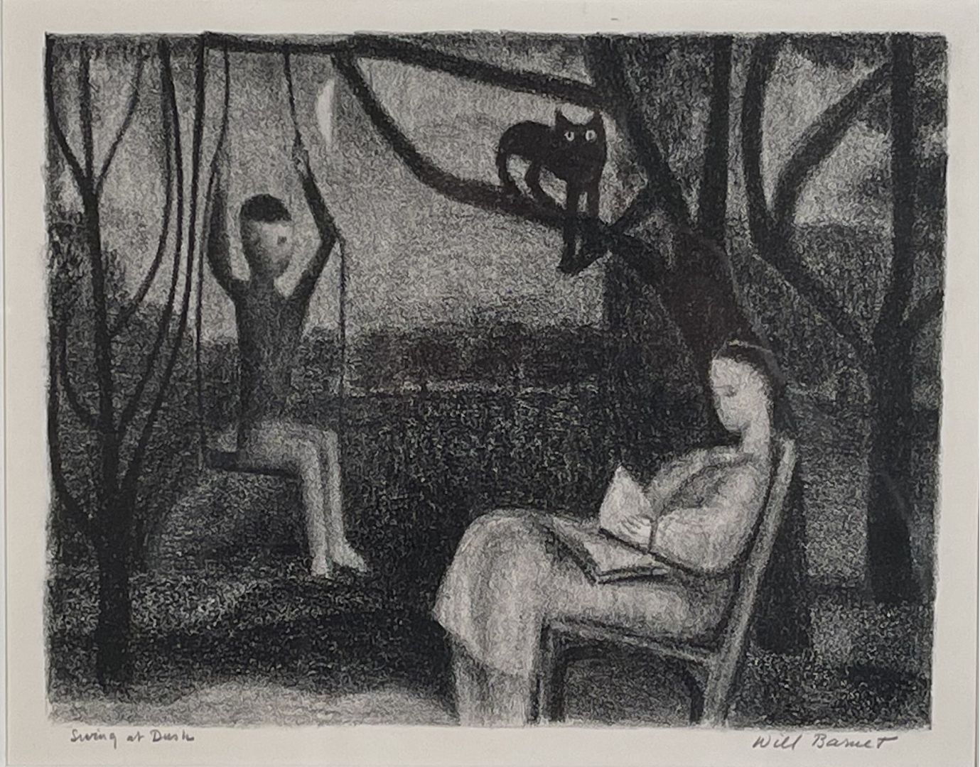 Barnet, Will. SWING AT DUSK. Szoke 95, Cole 94, Johnson 81. Lithograph, 1947. Edition of 25, printed by the artist on Rives Paper. 10 7/8 x 14 inches (image), 15 1/2 x 22 7/8 inches (sheet). Framed to 18 x 24 3/4 inches The subject and style are consistent with those created by Barnet and printed by him and Robert Blackburn and the Pritnmaking Workshop. In excellent condition.