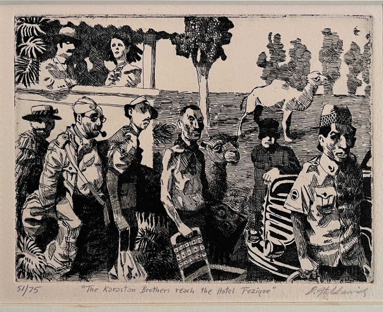 Itchkawitch, David (American, born 1937).THE KARISTON BROTHERS REACH THE HOTEL FEZIQUE . Etching, not dated. Edition of 75, numbered 51/75, and signed and titled in pencil. 4 7/8 X 6 3/4 (plate), 7 1/2 x 11 1/4 (sheet). With tack holes for drying and deckled edges. In excellent condition. David Itchkawitch was born in Rhode Island in 1937. He graduated from RISD and also studied in Italy as part of RISD's Honors Program. He has produced a large body of etchings of which he says, "My work represents invented situations which look believable at first glance. I feel it is almost a test to see whether I can create a believable, interesting situation with a good composition." He currently lives and works in Maine.