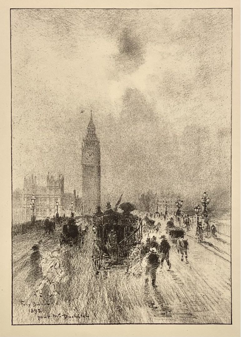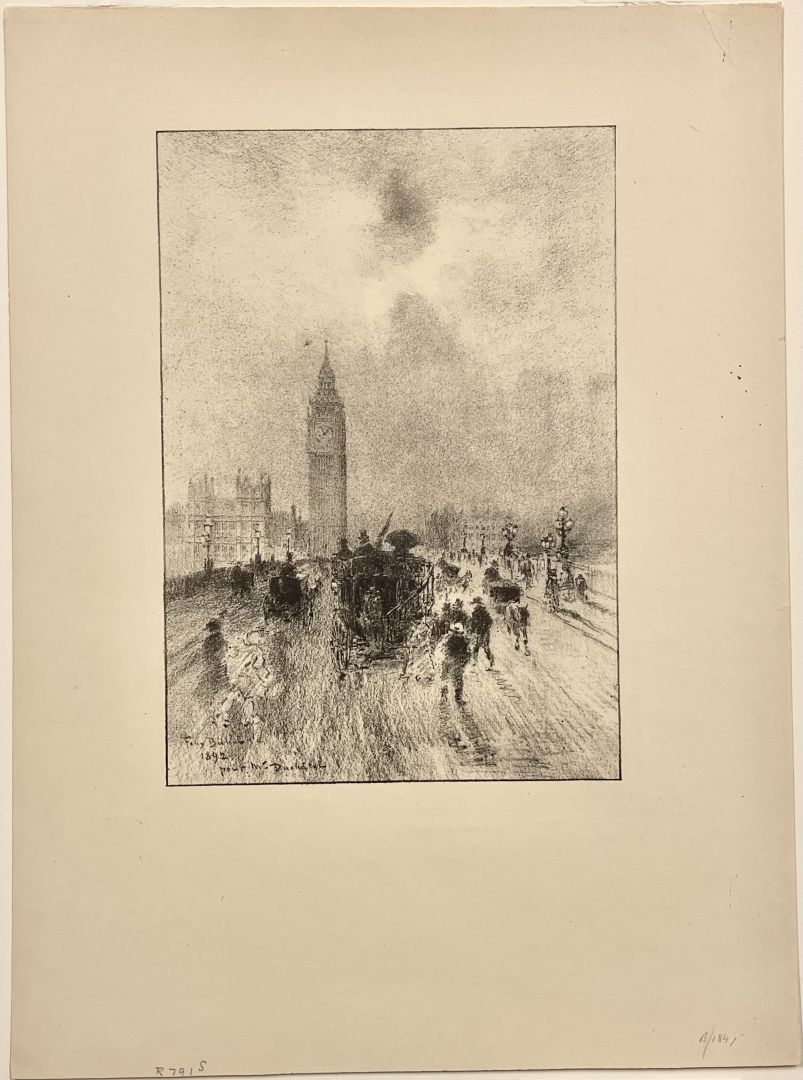 Buhot, Felix. THE VICTORIA CLOCK TOWER, LONDON. BG 184. Lithograph, 1892. 9 x 6 3/8 inches; 230 x 163 mm., image; sheet 15 x 11 inches; 381 x 279 mm. Signed in the stone "Felix Buhot 1892 pur M. Duchatel. Very good condition.