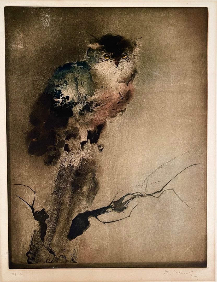 Moti. Kaiko (Indian/French, 1921-1989) UNTITLED (OWL) Color etching and aquatint on wove paper, not dated. Edition of 120. Signed in pencil, lower right, and numbered 3/120 lower left. 21 1/8 x 16 3/4 inches (plate). 30 x 22 inches (sheet).In excellent condition.Moti was born in Bombay and studied art there until 1946, when he moved to England. He received a Masters Degree in painting and sculpture from the Slade School, and also studied with the sculptor Reg Butler. He moved to France around 1950, where he lived for the rest of his life. In 1952 he began doing printmaking at Atelier 17, then still directed by S. W. Hayter. He utilised and enhanced the experimental techniques of printing with inks of differeng viscosity, the layering of which allows the creation of different textural effects in a single run through the press, a process which had been pioneered by Hayter and Krishna Reddy. For Moti, the effects emulated painterly tonalities reminicent of the works of Old Master and Romantic Painters. Moti had a long and successful career making prints using these methods..