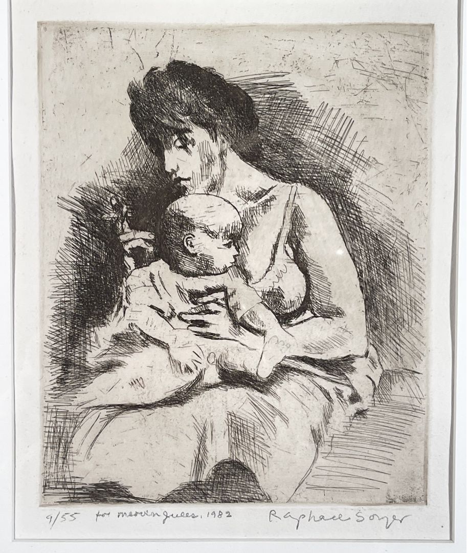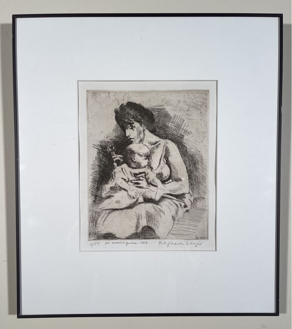 New Raphael SOYER UNTITLED (MOTHER AND CHILD) Soyer, Raphael. UNTITLED )MOTHER AND CHILD). Etching, not dated. Signed in pencil, numbered 9/55 and inscribed :"For Mervyn Jules, 1982." 11 x 9 inches, framed to 19 x 17 inches. In excellent condition. Inventory # 14675 Price: $750.00 Add to Cart