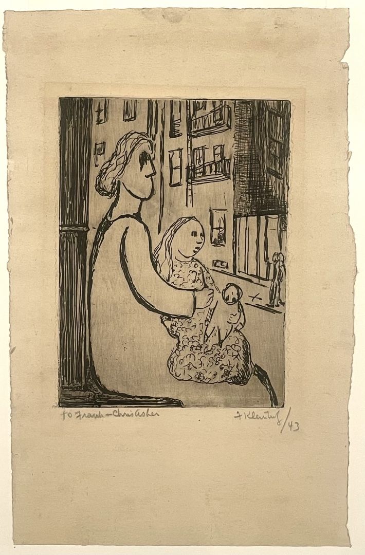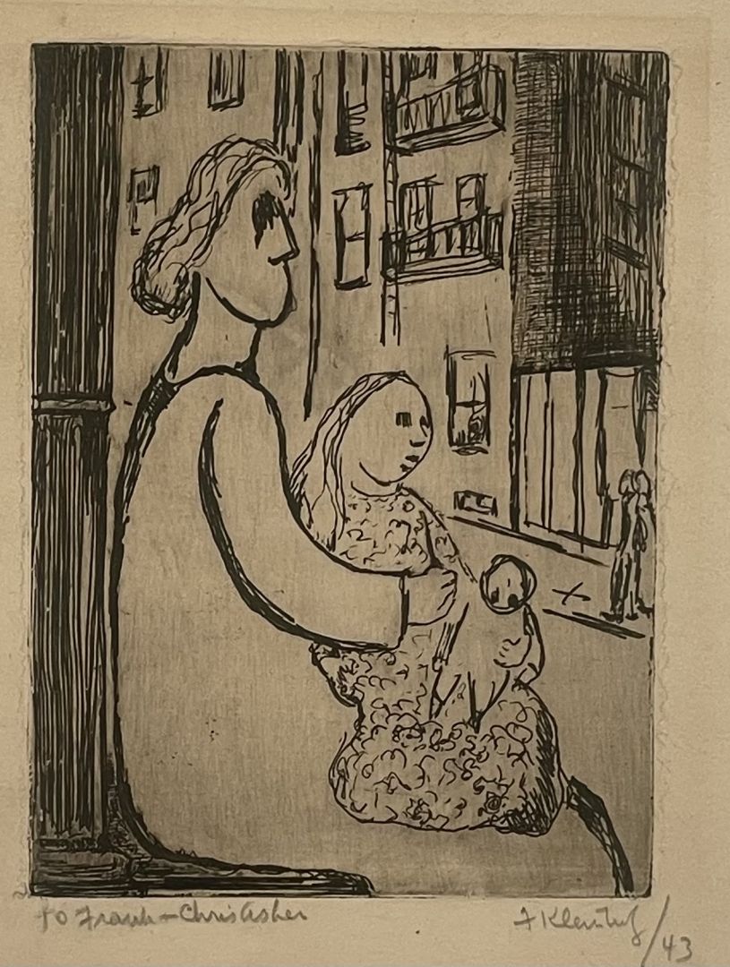 Kleinholz, Frank (American 1901-1987) UNTITLED (MOTHER, CHILD & DOLL).Etcing, 1943, edition not stated. Inscribed to a friend, at left, and signed and dated at right, all in pencil. 7 1/2 x 5 3/8 inches (plate), 12 3/4 x 8 inches (sheet). In very good conditon. A strong, expressionistic image of a mother and child sitting on a stoop in New York, looking out at the street. Invery good condition.