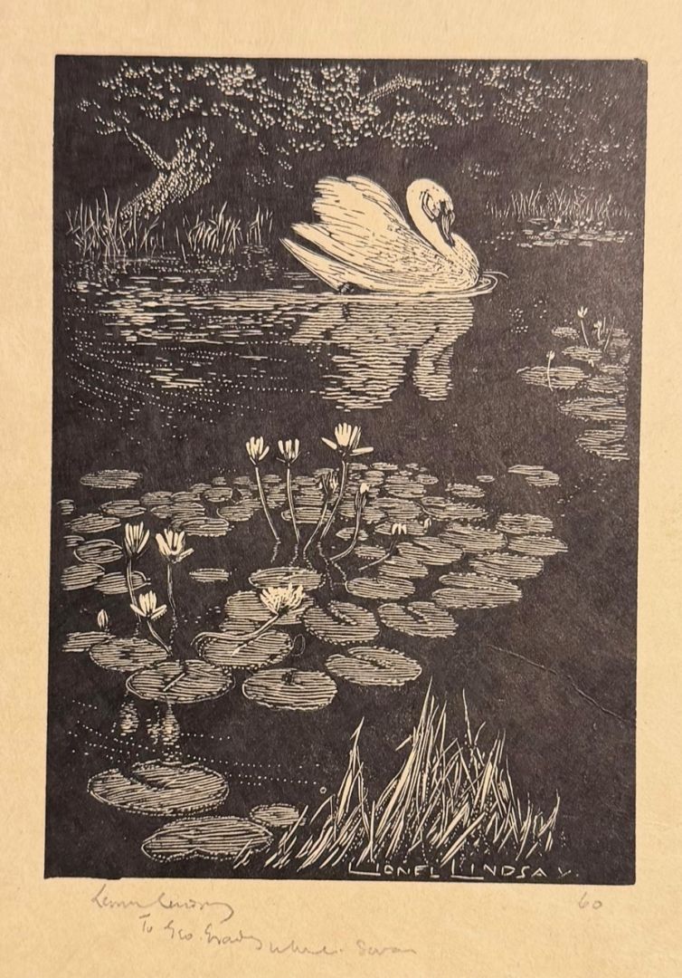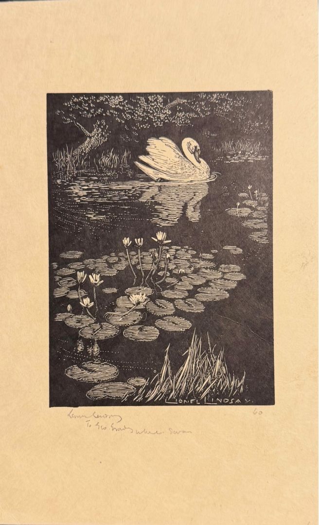 Lindsay, Lionel (Austarlian, 1874-1961). WHITE SWAN. Wood engraving, not dated, but circa 1920s. Edition OF 60. Signed in pencil and also in the block, titled and inscribed "60," and also inscribed "To Geo...." 4 x 3 inches (image), 6 5/8 x4 inches (sheet). In excellent condition.
