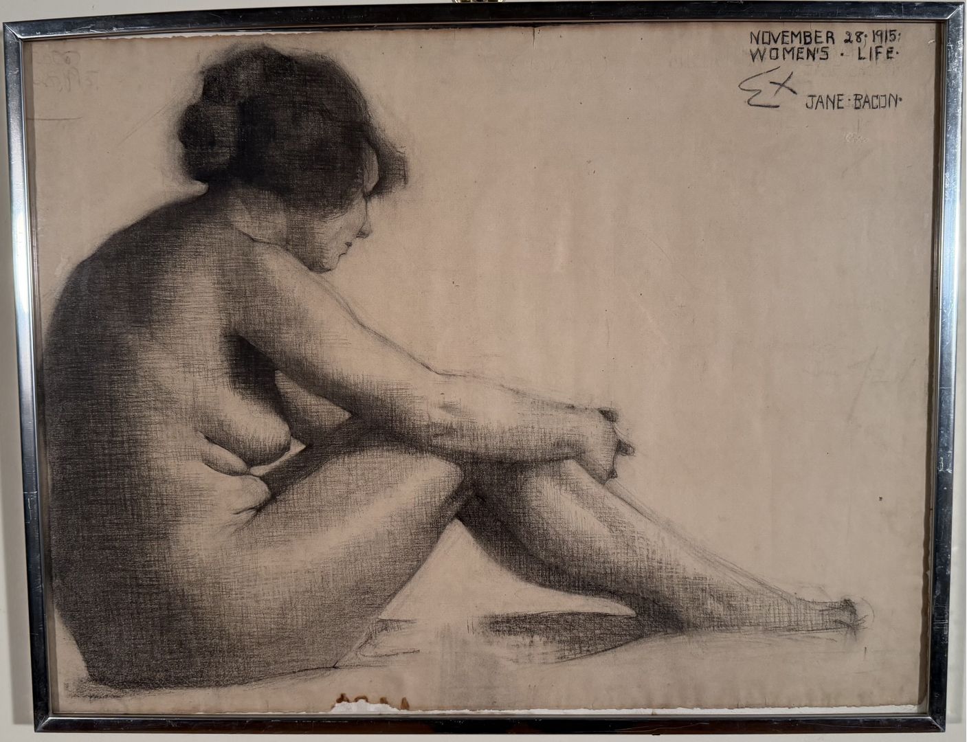 Bacon, Jane. WOMEN'S LIFE - NUDE STUDY. Drawingm charcoal on laid paper watermarked L. Biderville, France, 1915. An academic female nude, drawin in a Life Drawing class. Signed, Dated November 28, 1915, and inscribed "Women's Life." Also inscribed "Ex," likely meaning the instructor's evaluation of the drawing. 19 x 24 3/4 inches (sheet(,framed to 19 3/4 x 25 1/2 inches. A small area oflossat the bottom ofthe sheet, not affecting the drawing, else In very good condition.Edith Jane Bacon, 1879-1971 studied at the Art Institute of Chicago, and is best known as a "white line" printmaker who worked in Provincetown. We don't know that this work is by the same person.